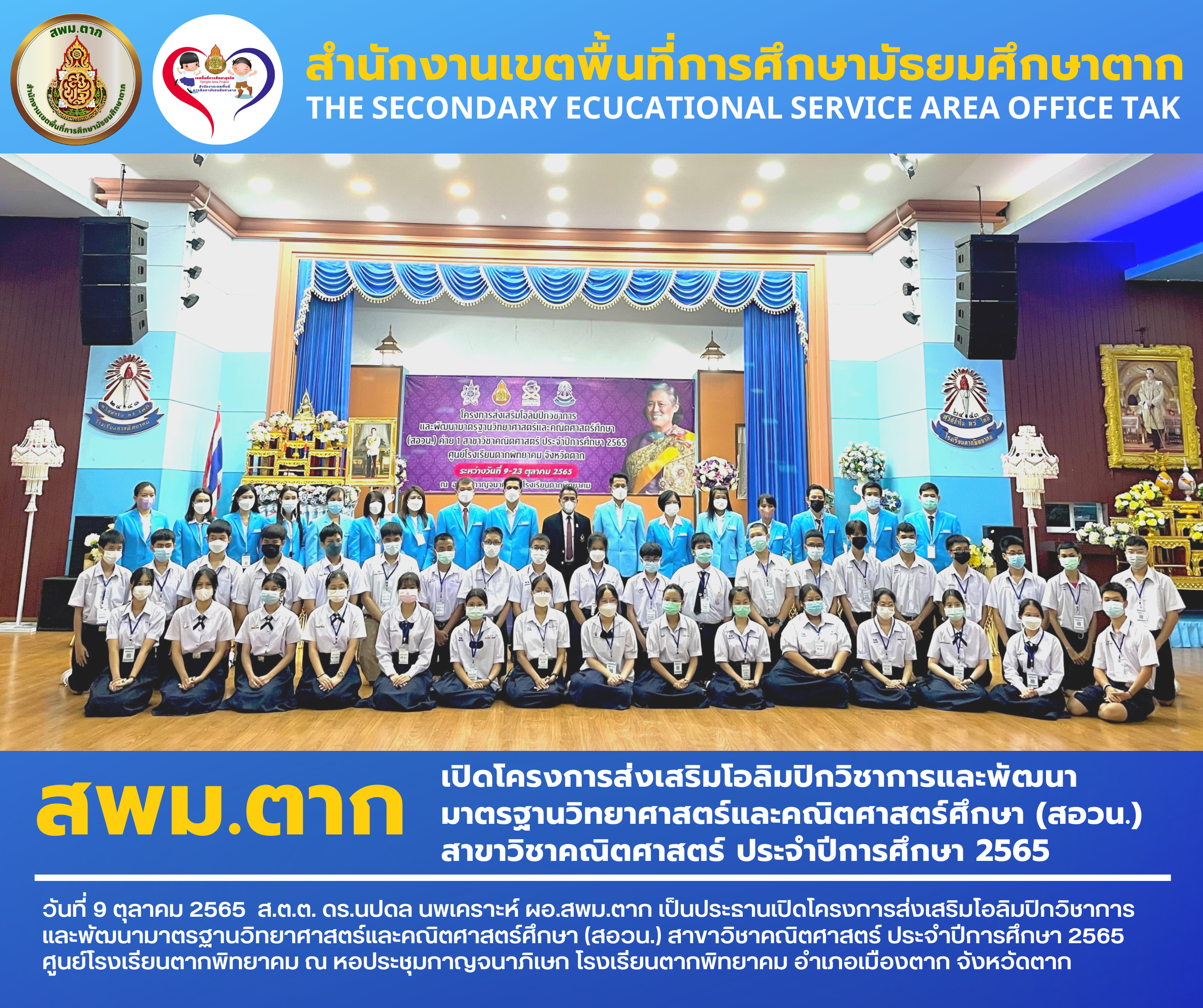 วันที่ 9 ตุลาคม 2565 ส.ต.ต. ดร.นปดล นพเคราะห์ ผอ.สพม.ตาก เป็นประธานเปิดโครงการส่งเสริมโอลิมปิกวิชาการ และพัฒนามาตรฐานวิทยาศาสตร์และคณิตศาสตร์ศึกษา (สอวน.) สาขาวิชาคณิตศาสตร์ ประจำปีการศึกษา 2565 ศูนย์โรงเรียนตากพิทยาคม ณ หอประชุมกาญจนาภิเษก โรงเรียนตากพิทยาคม อำเภอเมืองตาก จังหวัดตาก