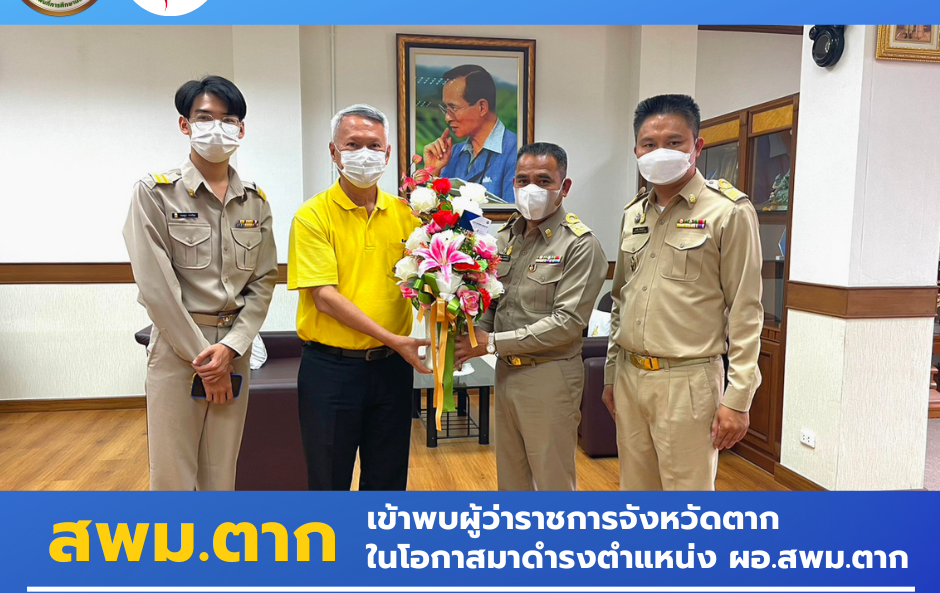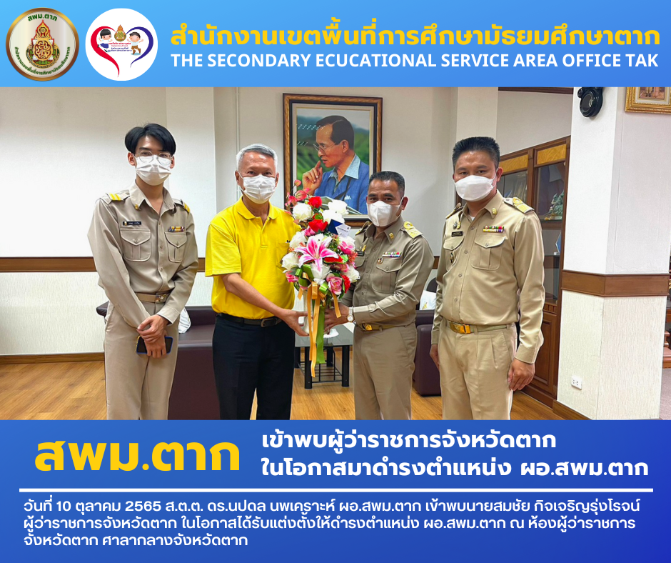สพม.ตาก เข้าพบผู้ว่าราชการจังหวัดตากในโอกาสมาดำรงตำแหน่ง ผอ.สพม.ตาก วรวุฒิ เนื้อนิ่ม 12 ตุลาคม 2565 วันที่ 10 ตุลาคม 2565 ส.ต.ต. ดร.นปดล นพเคราะห์ ผอ.สพม.ตาก เข้าพบนายสมชัย กิจเจริญรุ่งโรจน์ ผู้ว่าราชการจังหวัดตาก ในโอกาสได้รับแต่งตั้งให้ดำรงตำแหน่ง ผอ.สพม.ตาก ณ ห้องผู้ว่าราชการจังหวัดตาก ศาลากลางจังหวัดตาก จำนวนคนดู 4