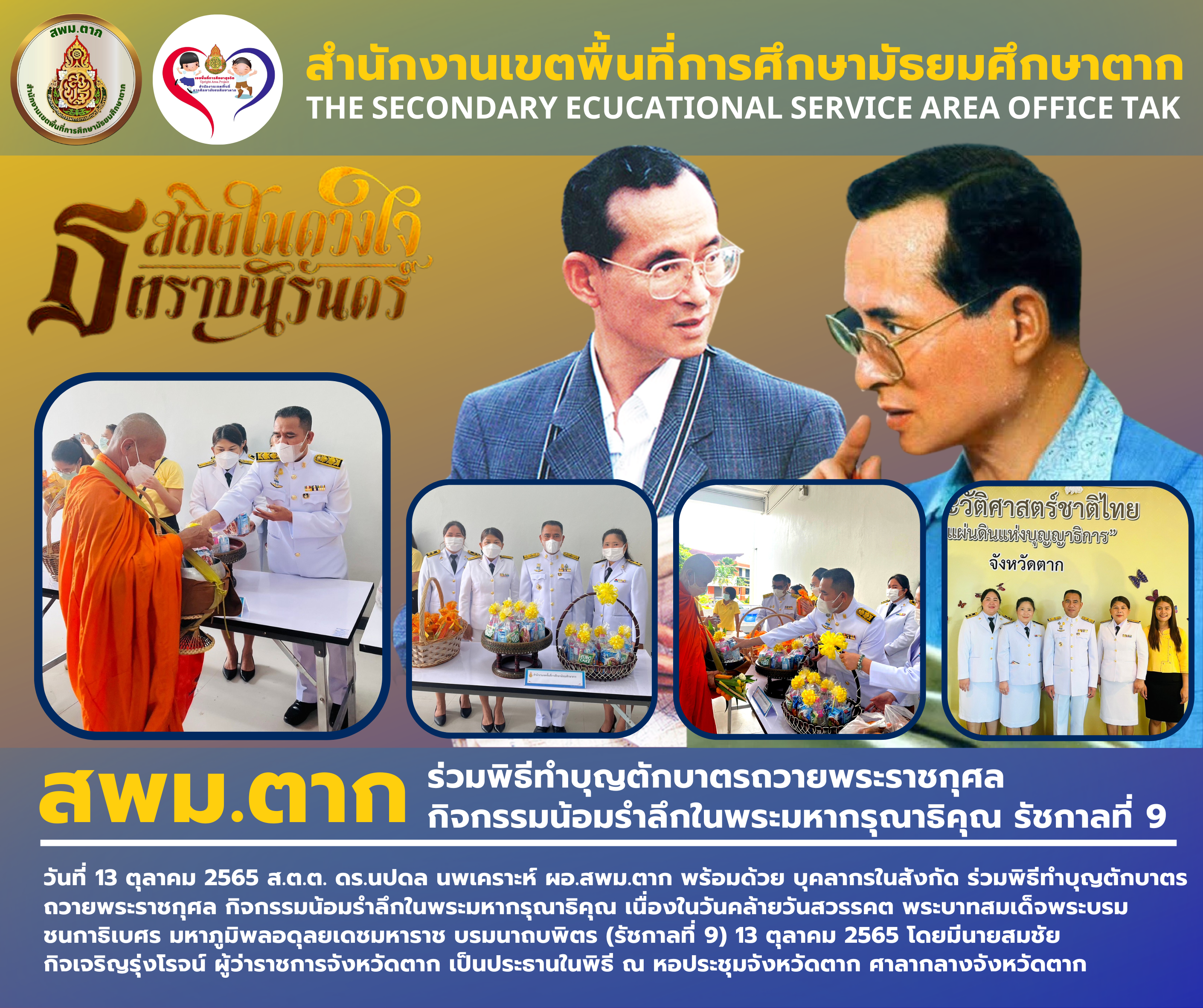 วันที่ 13 ตุลาคม 2565 ส.ต.ต. ดร.นปดล นพเคราะห์ ผอ.สพม.ตาก พร้อมด้วย บุคลากรในสังกัด ร่วมพิธีทำบุญตักบาตร ถวายพระราชกุศล กิจกรรมน้อมรำลึกในพระมหากรุณาธิคุณ เนื่องในวันคล้ายวันสวรรคต พระบาทสมเด็จพระบรม ชนกาธิเบศร มหาภูมิพลอดุลยเดชมหาราช บรมนาถบพิตร (รัชกาลที่ 9) 13 ตุลาคม 2565 โดยมีนายสมชัย กิจเจริญรุ่งโรจน์ ผู้ว่าราชการจังหวัดตาก เป็นประธานในพิธี ณ หอประชุมจังหวัดตาก ศาลากลางจังหวัดตาก