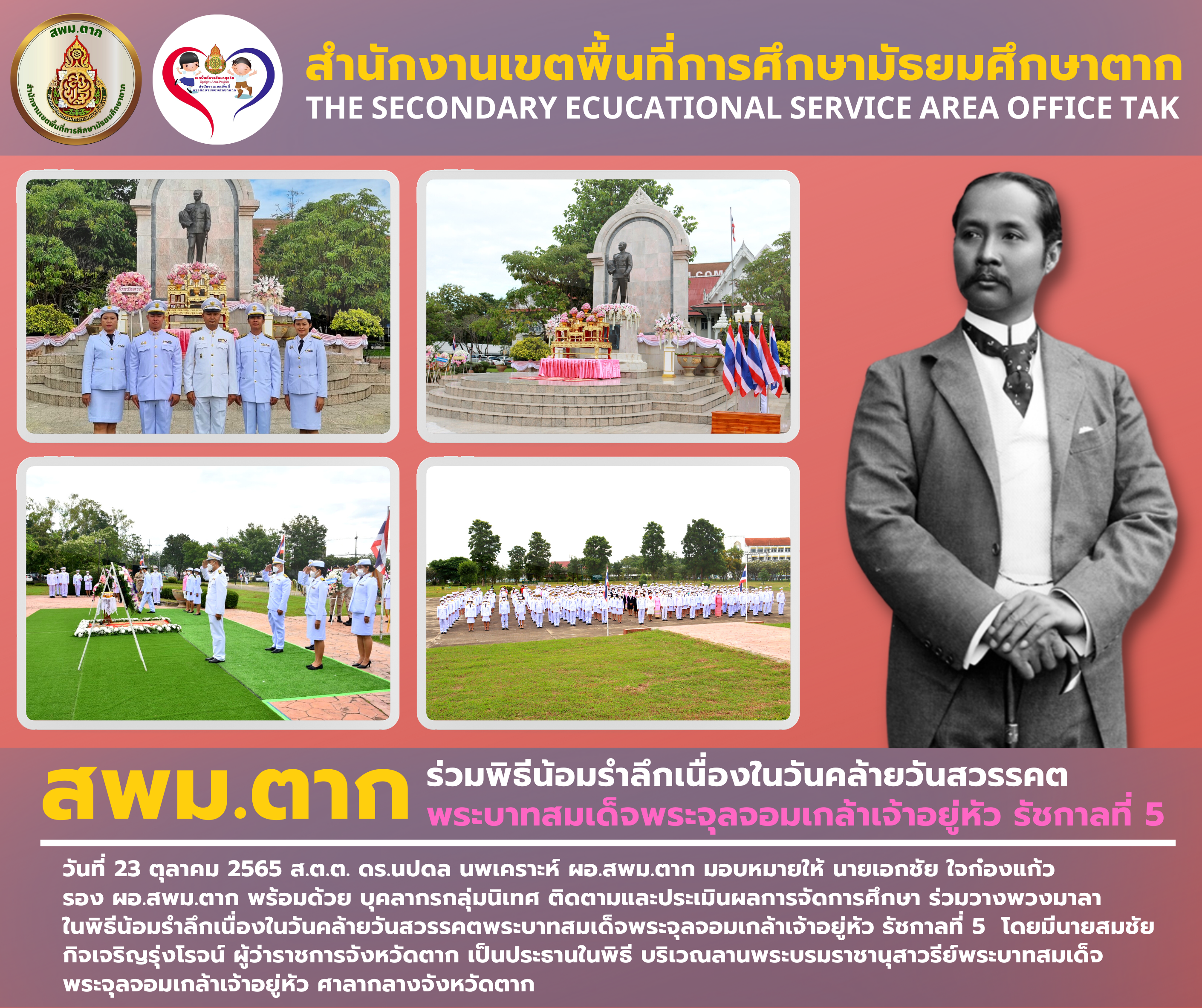 สพม.ตาก ร่วมพิธีน้อมรำลึกเนื่องในวันคล้ายวันสวรรคต พระบาทสมเด็จพระจุลจอมเกล้าเจ้าอยู่หัว รัชกาลที่ 5 วรวุฒิ เนื้อนิ่ม 25 ตุลาคม 2565 จำนวนคนดู 1