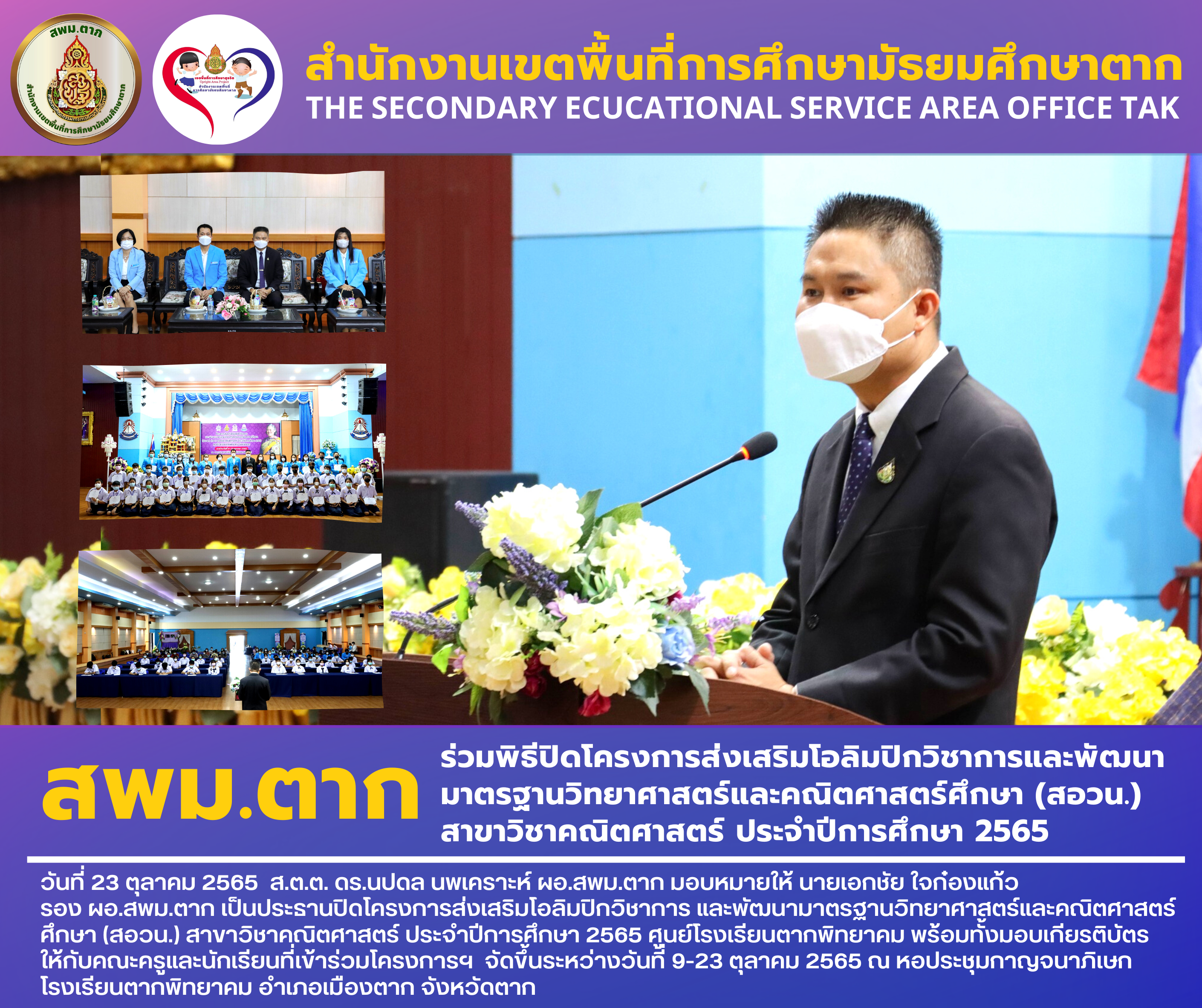 วันที่ 23 ตุลาคม 2565 ส.ต.ต. ดร.นปดล นพเคราะห์ ผอ.สพม.ตาก มอบหมายให้ นายเอกชัย ใจก๋องแก้ว รอง ผอ.สพม.ตาก เป็นประธานปิดโครงการส่งเสริมโอลิมปิกวิชาการ และพัฒนามาตรฐานวิทยาศาสตร์และคณิตศาสตร์ศึกษา (สอวน.) สาขาวิชาคณิตศาสตร์ ประจำปีการศึกษา 2565 ศูนย์โรงเรียนตากพิทยาคม พร้อมทั้งมอบเกียรติบัตร ให้กับคณะครูและนักเรียนที่เข้าร่วมโครงการฯ จัดขึ้นระหว่างวันที่ 9-23 ตุลาคม 2565 ณ หอประชุมกาญจนาภิเษก โรงเรียนตากพิทยาคม อำเภอเมืองตาก จังหวัดตาก