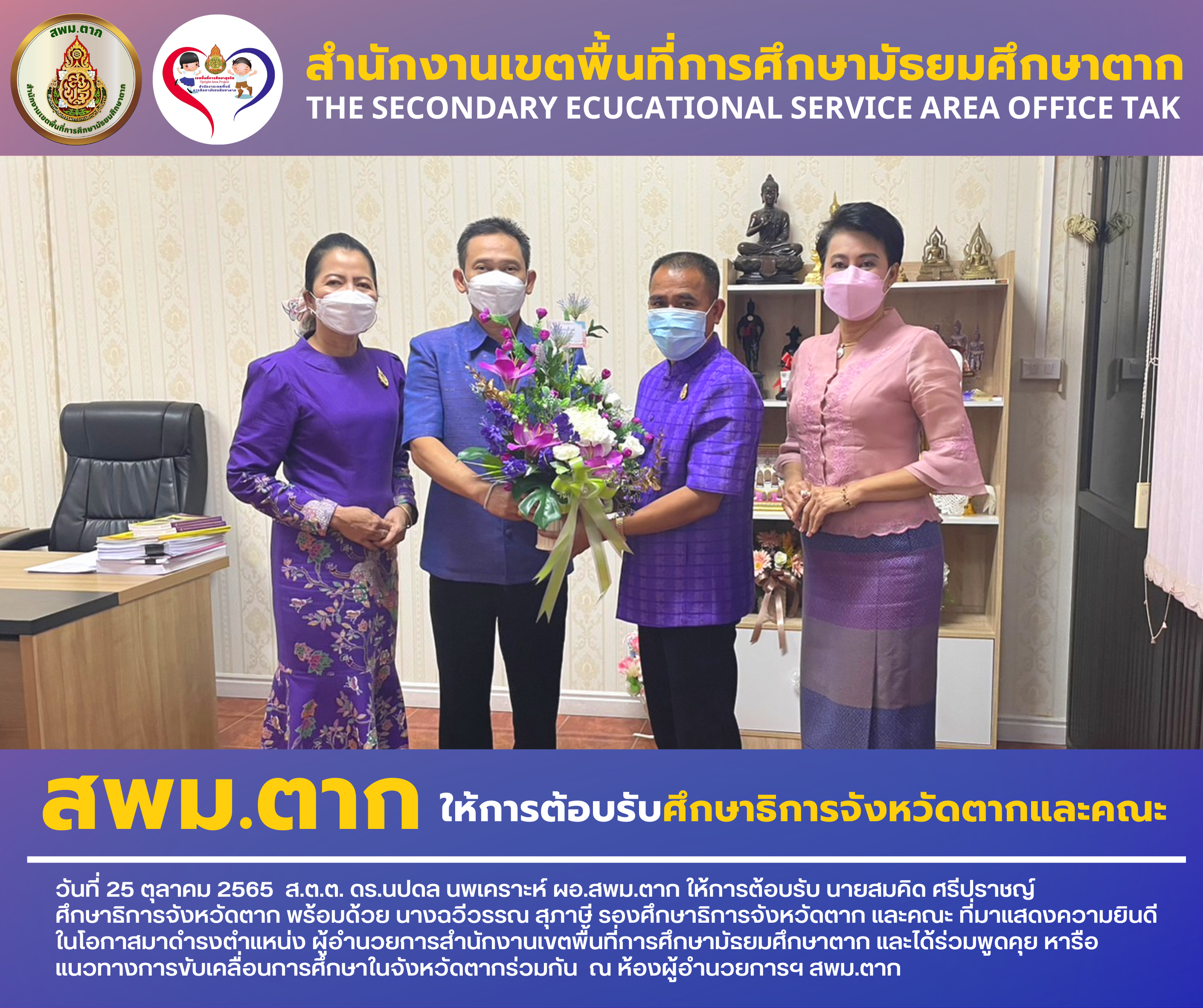 วันที่ 25 ตุลาคม 2565 ส.ต.ต. ดร.นปดล นพเคราะห์ ผอ.สพม.ตาก ให้การต้อบรับ นายสมคิด ศรีปราชญ์ ศึกษาธิการจังหวัดตาก พร้อมด้วย นางฉวีวรรณ สุภาษี รองศึกษาธิการจังหวัดตาก และคณะ ที่มาแสดงความยินดี ในโอกาสมาดำรงตำแหน่ง ผู้อำนวยการสำนักงานเขตพื้นที่การศึกษามัธยมศึกษาตาก และได้ร่วมพูดคุย หารือ แนวทางการขับเคลื่อนการศึกษาในจังหวัดตากร่วมกัน ณ ห้องผู้อำนวยการฯ สพม.ตาก