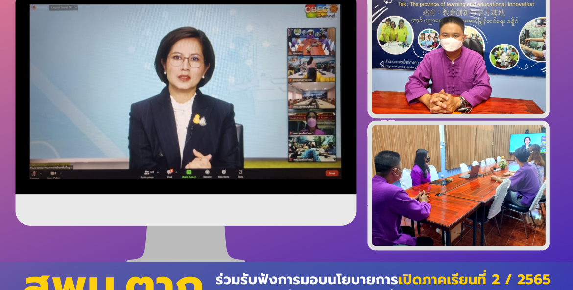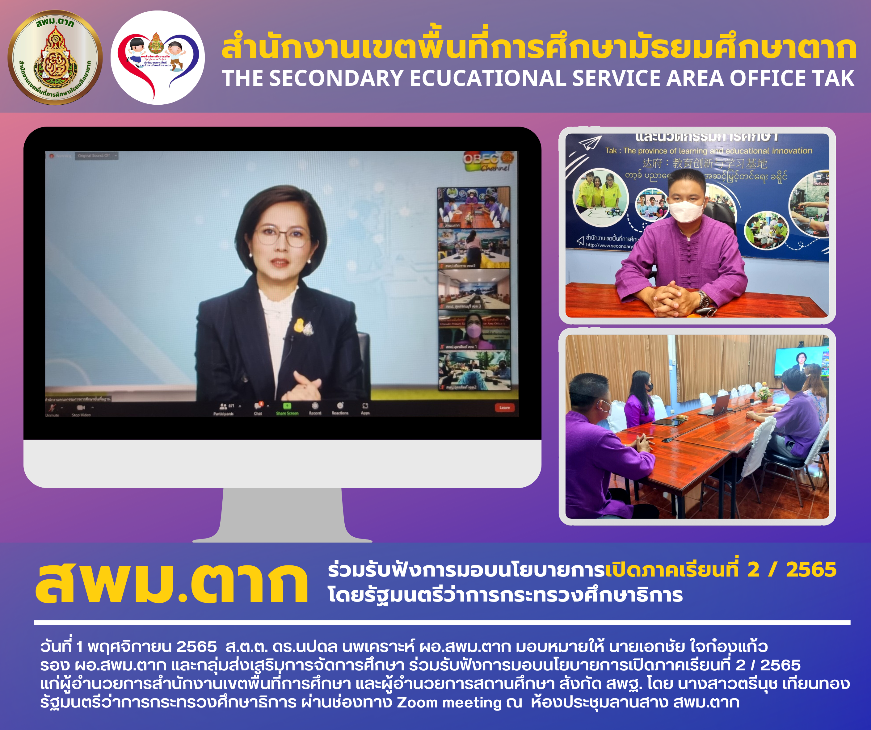 วันที่ 1 พฤศจิกายน 2565 ส.ต.ต. ดร.นปดล นพเคราะห์ ผอ.สพม.ตาก มอบหมายให้ นายเอกชัย ใจก๋องแก้ว รอง ผอ.สพม.ตาก และกลุ่มส่งเสริมการจัดการศึกษา ร่วมรับฟังการมอบนโยบายการเปิดภาคเรียนที่ 2 / 2565 แก่ผู้อำนวยการสำนักงานเขตพื้นที่การศึกษา และผู้อำนวยการสถานศึกษา สังกัด สพฐ. โดย นางสาวตรีนุช เทียนทอง รัฐมนตรีว่าการกระทรวงศึกษาธิการ ผ่านช่องทาง Zoom meeting ณ ห้องประชุมลานสาง สพม.ตาก