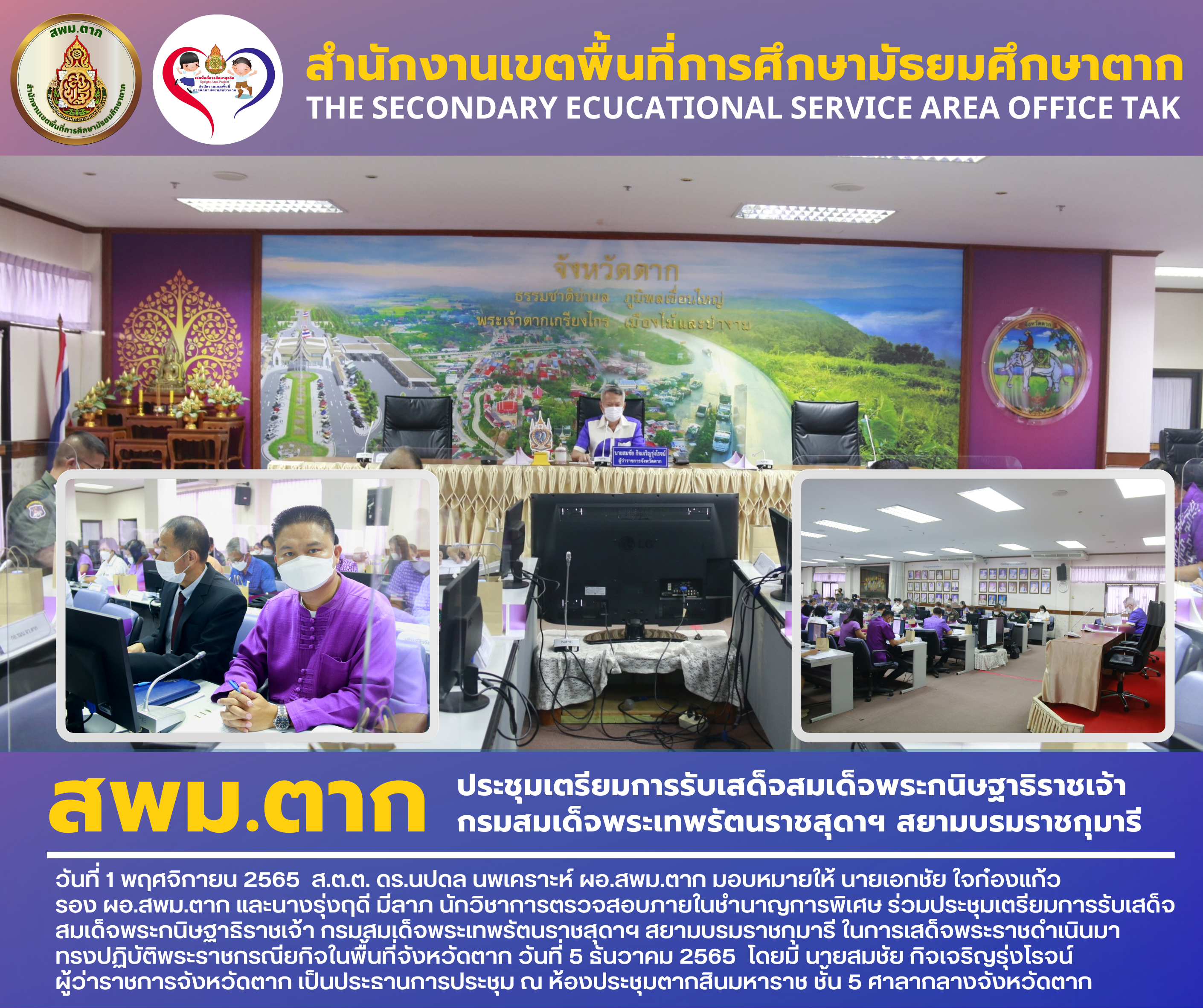 วันที่ 1 พฤศจิกายน 2565 ส.ต.ต. ดร.นปดล นพเคราะห์ ผอ.สพม.ตาก มอบหมายให้ นายเอกชัย ใจก๋องแก้ว รอง ผอ.สพม.ตาก และนางรุ่งฤดี มีลาภ นักวิชาการตรวจสอบภายในชำนาญการพิเศษ ร่วมประชุมเตรียมการรับเสด็จสมเด็จพระกนิษฐาธิราชเจ้า กรมสมเด็จพระเทพรัตนราชสุดาฯ สยามบรมราชกุมารี ในการเสด็จพระราชดำเนินมา ทรงปฏิบัติพระราชกรณียกิจในพื้นที่จังหวัดตาก วันที่ 5 ธันวาคม 2565 โดยมี นายสมชัย กิจเจริญรุ่งโรจน์ ผู้ว่าราชการจังหวัดตาก เป็นประธานการประชุม ณ ห้องประชุมตากสินมหาราช ชั้น 5 ศาลากลางจังหวัดตาก