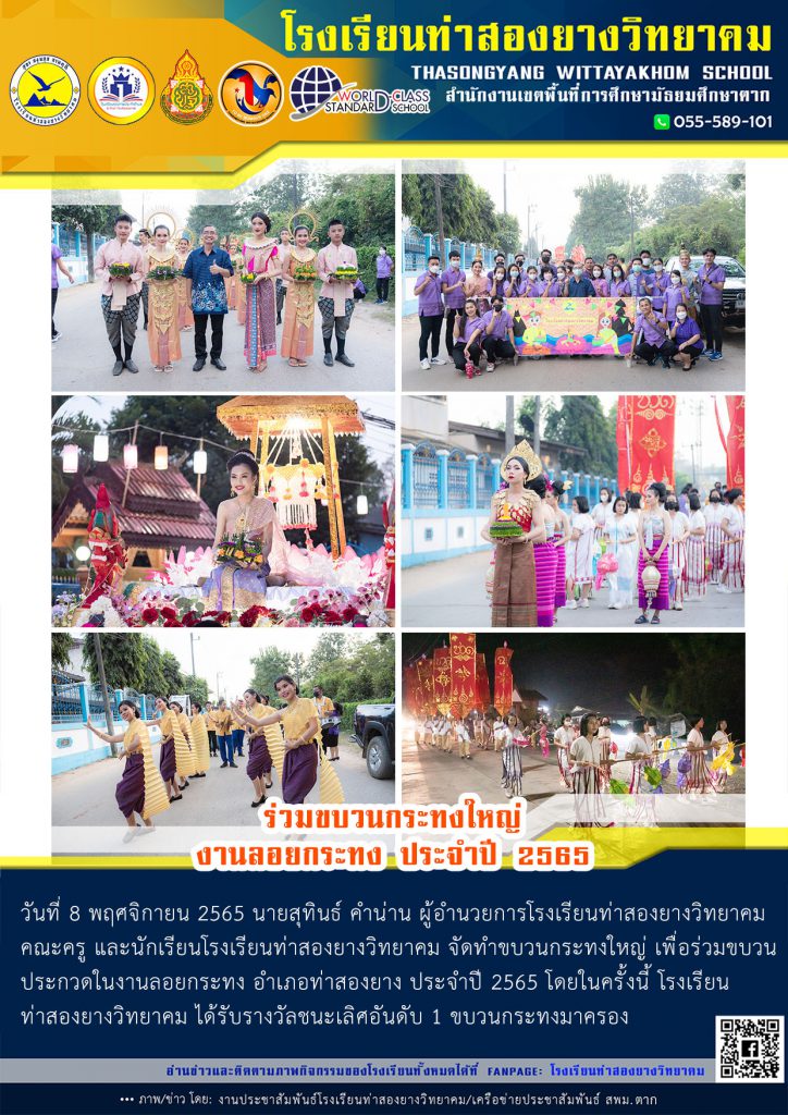 โรงเรียนท่าสองยางวิทยาคม จัดทำขบวนกระทงใหญ่ เพื่อร่วมขบวนประกวดในงานลอยกระทง อำเภอท่าสองยาง ประจำปี 2565 พชร โพธิ์อ่วม 11 พฤศจิกายน 2565 จำนวนคนดู 28