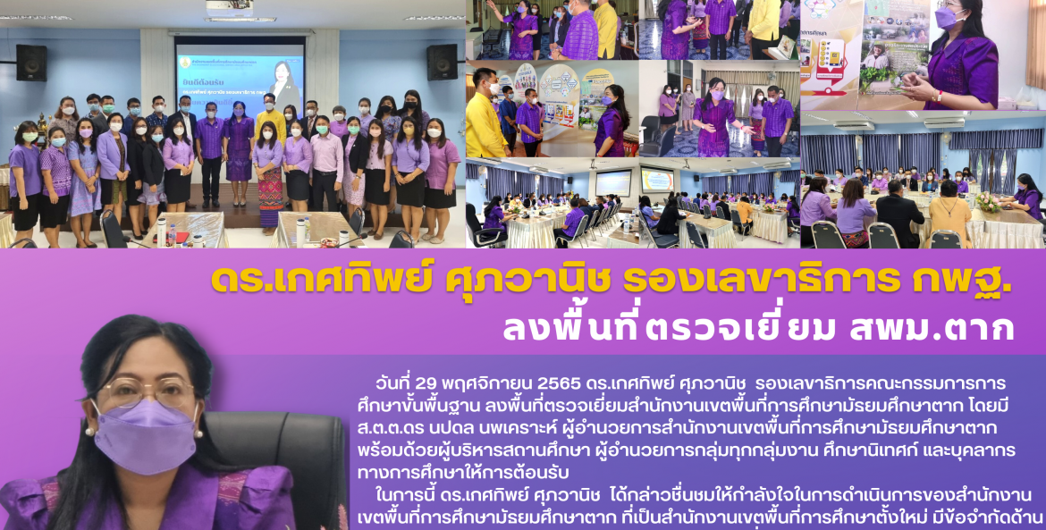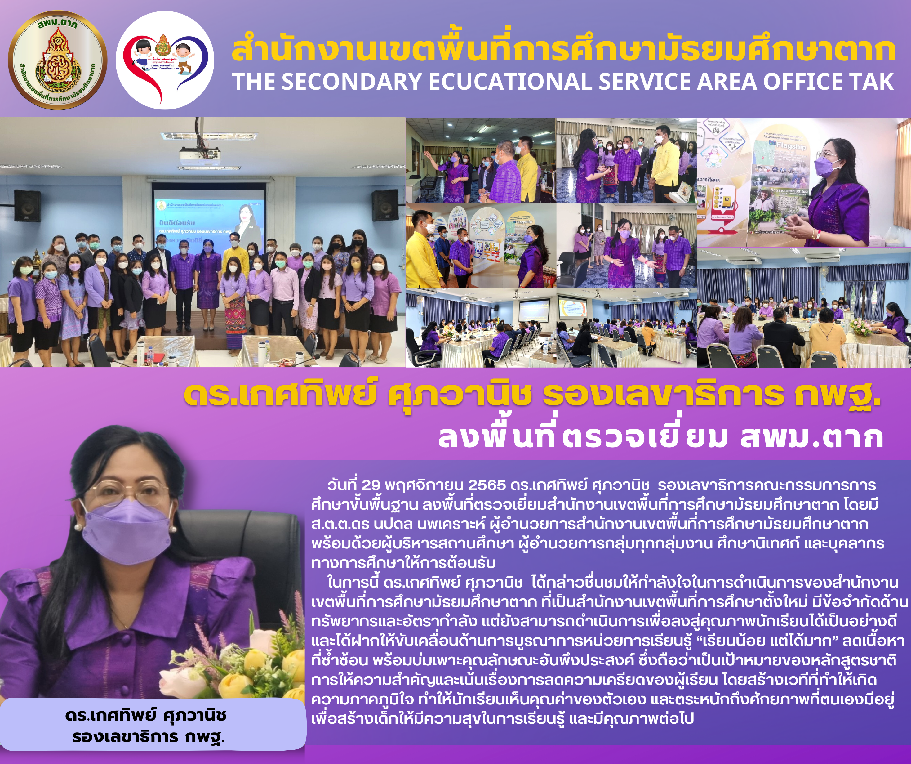 วันที่ 29 พฤศจิกายน 2565 ดร.เกศทิพย์ ศุภวานิช รองเลขาธิการคณะกรรมการการศึกษาขั้นพื้นฐาน ลงพื้นที่ตรวจเยี่ยมสำนักงานเขตพื้นที่การศึกษามัธยมศึกษาตาก โดยมี ส.ต.ต.ดร นปดล นพเคราะห์ ผู้อำนวยการสำนักงานเขตพื้นที่การศึกษามัธยมศึกษาตาก พร้อมด้วยผู้บริหารสถานศึกษา ผู้อำนวยการกลุ่มทุกกลุ่มงาน ศึกษานิเทศก์ และบุคลากรทางการศึกษาให้การต้อนรับ ในการนี้ ดร.เกศทิพย์ ศุภวานิช ได้กล่าวชื่นชมให้กำลังใจในการดำเนินการของสำนักงานเขตพื้นที่การศึกษามัธยมศึกษาตาก ที่เป็นสำนักงานเขตพื้นที่การศึกษาตั้งใหม่ มีข้อจำกัดด้านทรัพยากรและอัตรากำลัง แต่ยังสามารถดำเนินการเพื่อลงสู่คุณภาพนักเรียนได้เป็นอย่างดี และได้ฝากให้ขับเคลื่อนด้านการบูรณาการหน่วยการเรียนรู้ “เรียนน้อย แต่ได้มาก” ลดเนื้อหาที่ซ้ำซ้อน พร้อมบ่มเพาะคุณลักษณะอันพึงประสงค์ ซึ่งถือว่าเป็นเป้าหมายของหลักสูตรชาติ การให้ความสำคัญและเน้นเรื่องการลดความเครียดของผู้เรียน โดยสร้างเวทีที่ทำให้เกิดความภาคภูมิใจ ทำให้นักเรียนเห็นคุณค่าของตัวเอง และตระหนักถึงศักยภาพที่ตนเองมีอยู่ เพื่อสร้างเด็กให้มีความสุขในการเรียนรู้ และมีคุณภาพต่อไป