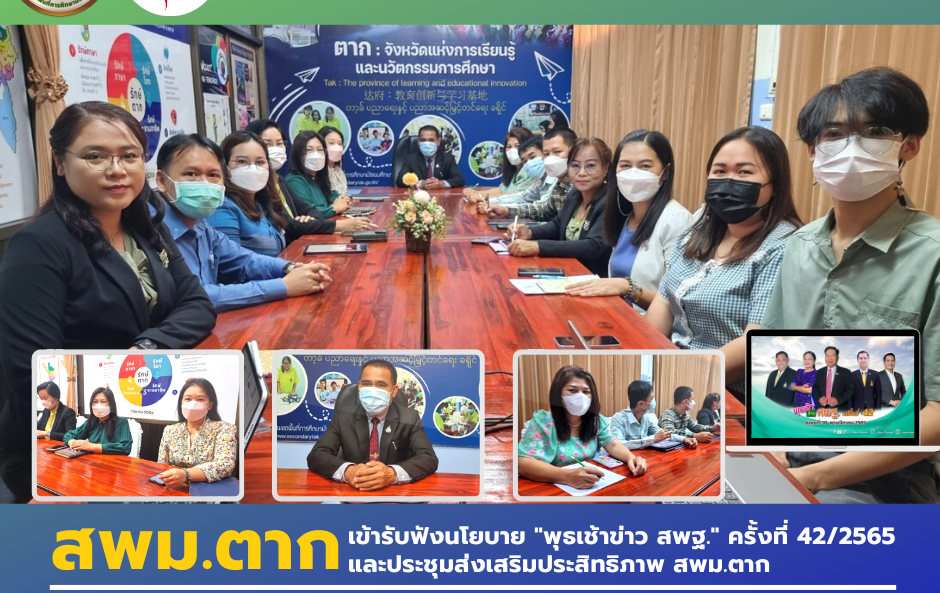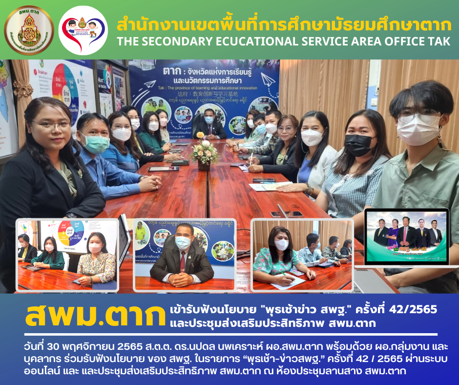 วันที่ 30 พฤศจิกายน 2565 ส.ต.ต. ดร.นปดล นพเคราะห์ ผอ.สพม.ตาก พร้อมด้วย ผอ.กลุ่มงาน และบุคลากร ร่วมรับฟังนโยบาย ของ สพฐ. ในรายการ “พุธเช้า–ข่าวสพฐ.” ครั้งที่ 42 / 2565 ผ่านระบบออนไลน์ และ และประชุมส่งเสริมประสิทธิภาพ สพม.ตาก ณ ห้องประชุมลานสาง สพม.ตาก
