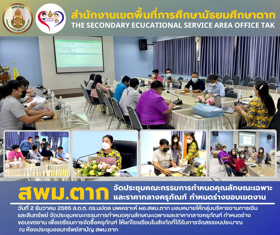 วันที่ 2 ธันวาคม 2565 ส.ต.ต. ดร.นปดล นพเคราะห์ ผอ.สพม.ตาก มอบหมายให้กลุ่มบริหารงานการเงินและสินทรัพย์ จัดประชุมคณะกรรมการกำหนดคุณลักษณะเฉพาะและราคากลางครุภัณฑ์ กำหนดร่างขอบเขตงาน เพื่อเตรียมการจัดซื้อครุภัณฑ์ให้แก่โรงเรียนในสังกัดที่ได้รับการจัดสรรงบประมาณ ณ ห้องประชุมออมทรัพย์สามัญ สพม.ตาก