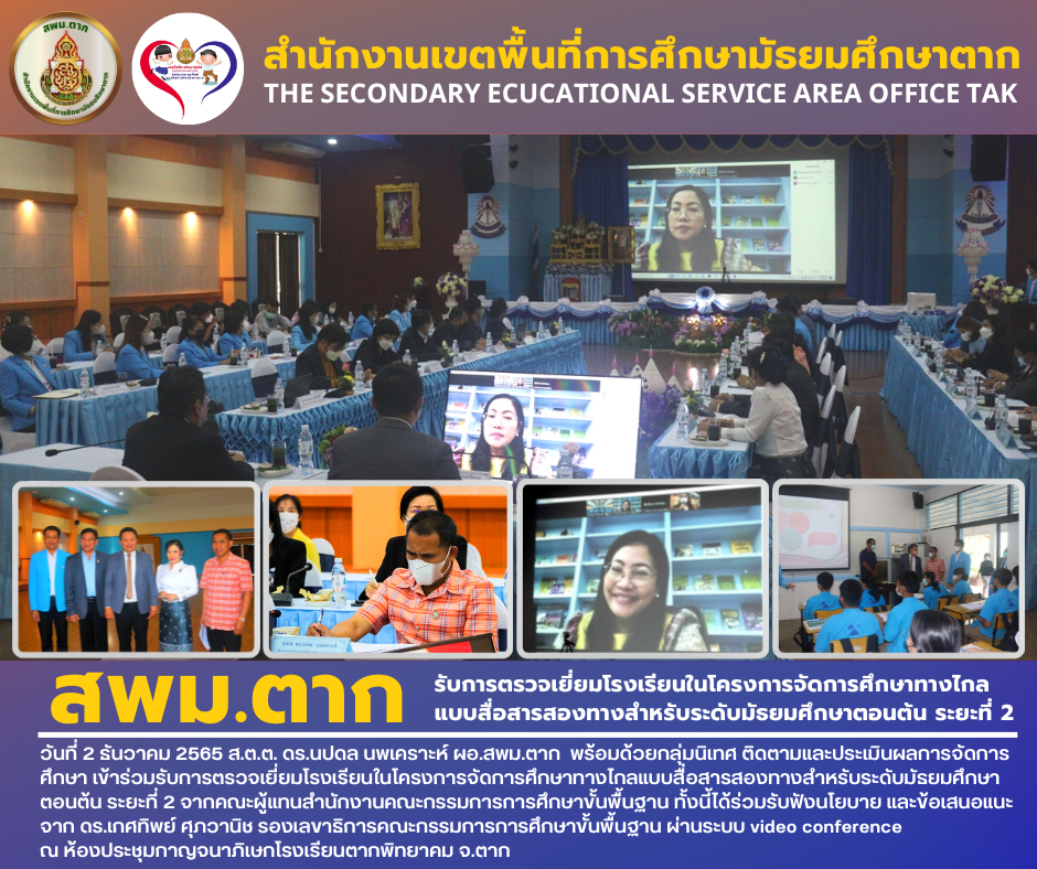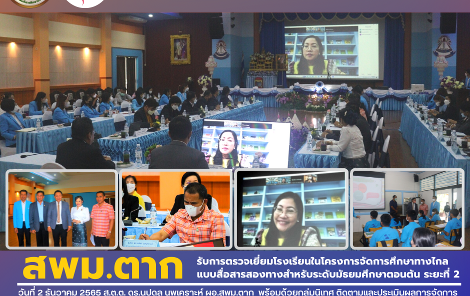 วันที่ 2 ธันวาคม 2565 ส.ต.ต. ดร.นปดล นพเคราะห์ ผอ.สพม.ตาก พร้อมด้วยกลุ่มนิเทศ ติดตามและประเมินผลการจัดการศึกษา เข้าร่วมรับการตรวจเยี่ยมโรงเรียนในโครงการจัดการศึกษาทางไกลแบบสื่อสารสองทางสำหรับระดับมัธยมศึกษาตอนต้น ระยะที่ 2 จากคณะผู้แทนสำนักงานคณะกรรมการการศึกษาขั้นพื้นฐาน ทั้งนี้ได้ร่วมรับฟังนโยบาย และข้อเสนอแนะจาก ดร.เกศทิพย์ ศุภวานิช รองเลขาธิการคณะกรรมการการศึกษาขั้นพื้นฐาน ผ่านระบบ video conference ณ ห้องประชุมกาญจนาภิเษกโรงเรียนตากพิทยาคม จ.ตาก