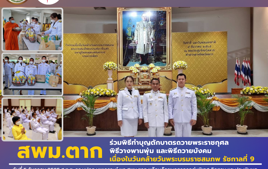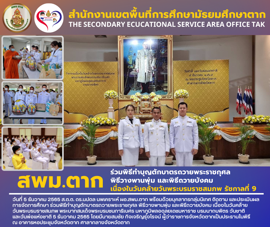 วันที่ 5 ธันวาคม 2565 ส.ต.ต. ดร.นปดล นพเคราะห์ ผอ.สพม.ตาก พร้อมด้วยบุคลากรกลุ่มนิเทศ ติดตาม และประเมินผลการจัดการศึกษา ร่วมพิธีทำบุญตักบาตรถวายพระราชกุศล พิธีวางพานพุ่ม และพิธีถวายบังคม เนื่องในวันคล้ายวันพระบรมราชสมภพ พระบาทสมเด็จพระบรมชนกาธิเบศร มหาภูมิพลอดุลยเดชมหาราช บรมนาถบพิตร วันชาติ และวันพ่อแห่งชาติ 5 ธันวาคม 2565 โดยมีนายสมชัย กิจเจริญรุ่งโรจน์ ผู้ว่าราชการจังหวัดตากเป็นประธานในพิธี ณ อาคารหอประชุมจังหวัดตาก ศาลากลางจังหวัดตาก