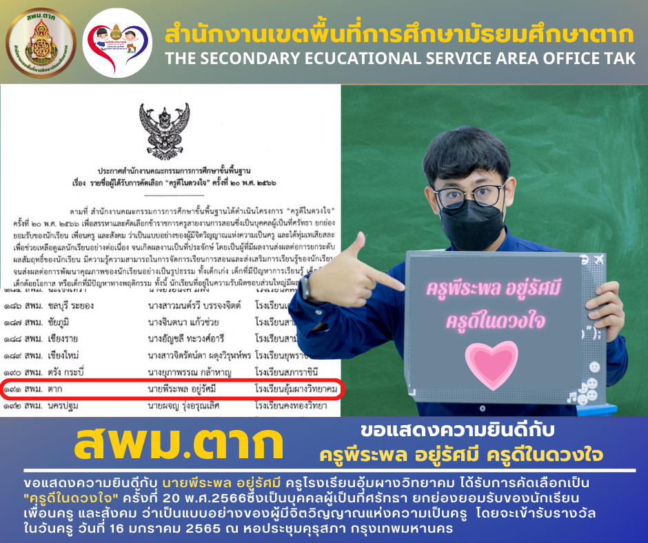 ขอแสดงความยินดีกับ นายพีระพล อยู่รัศมี ครูโรงเรียนอุ้มผางวิทยาคม ได้รับการคัดเลือกเป็น “ครูดีในดวงใจ” ครั้งที่ 20 พ.ศ.2566ซึ่งเป็นบุคคลผู้เป็นที่ศรัทธา ยกย่องยอมรับของนักเรียน เพื่อนครู และสังคม ว่าเป็นแบบอย่างของผู้มีจิตวิญญาณแห่งความเป็นครู โดยจะเข้ารับรางวัล ในวันครู วันที่ 16 มกราคม 2565 ณ หอประชุมคุรุสภา กรุงเทพมหานคร