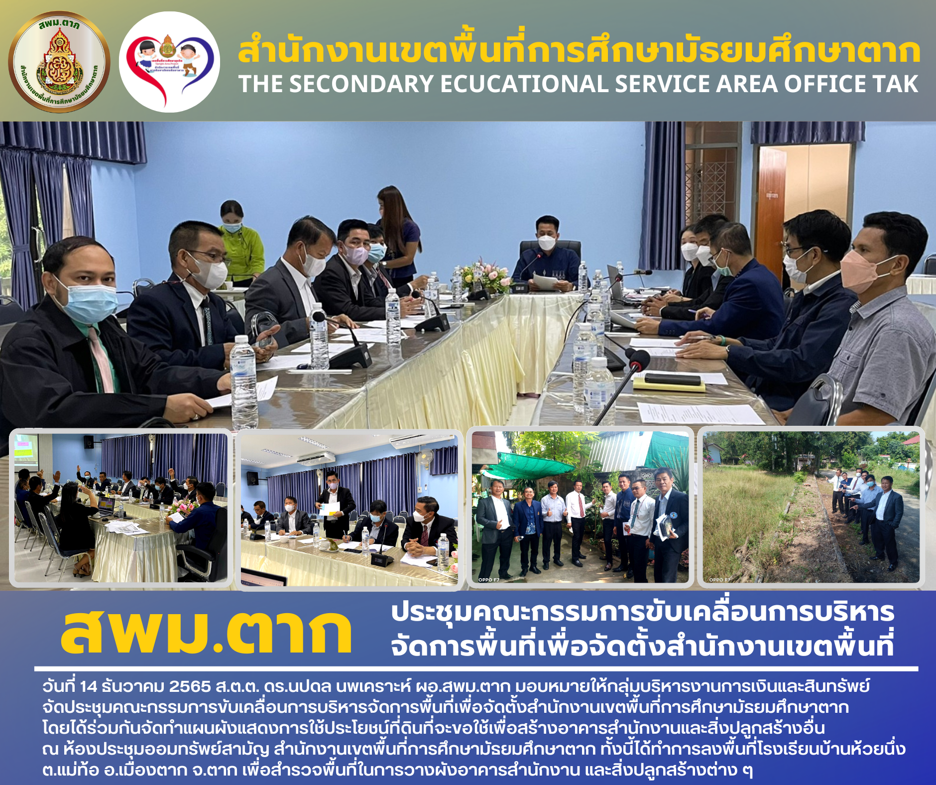 วันที่ 14 ธันวาคม 2565 ส.ต.ต. ดร.นปดล นพเคราะห์ ผอ.สพม.ตาก มอบหมายให้กลุ่มบริหารงานการเงินและสินทรัพย์ จัดประชุมคณะกรรมการขับเคลื่อนการบริหารจัดการพื้นที่เพื่อจัดตั้งสำนักงานเขตพื้นที่การศึกษามัธยมศึกษาตาก โดยได้ร่วมกันจัดทำแผนผังแสดงการใช้ประโยชน์ที่ดินที่จะขอใช้เพื่อสร้างอาคารสำนักงานและสิ่งปลูกสร้างอื่น ณ ห้องประชุมออมทรัพย์สามัญ สำนักงานเขตพื้นที่การศึกษามัธยมศึกษาตาก ทั้งนี้ได้ทำการลงพื้นที่โรงเรียนบ้านห้วยนึ่ง ต.แม่ท้อ อ.เมืองตาก จ.ตาก เพื่อสำรวจพื้นที่ในการวางผังอาคารสำนักงาน และสิ่งปลูกสร้างต่าง ๆ