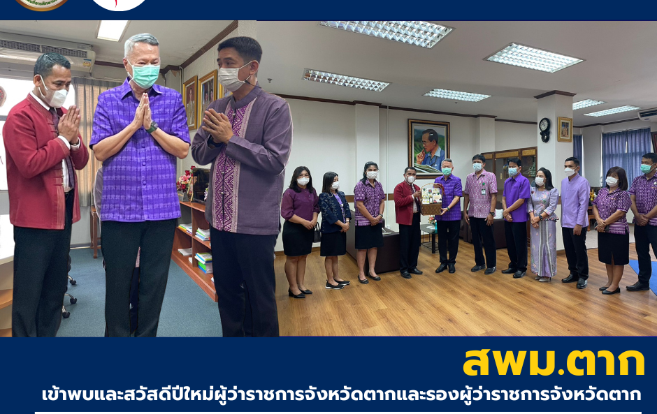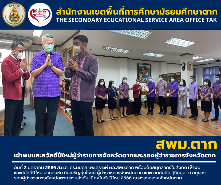 วันที่ 3 มกราคม 2566 ส.ต.ต. ดร.นปดล นพเคราะห์ ผอ.สพม.ตาก พร้อมด้วยบุคลากรในสังกัด เข้าพบ และสวัสดีปีใหม่ นายสมชัย กิจเจริญรุ่งโรจน์ ผู้ว่าราชการจังหวัดตาก และนายสวนิต สุริยกุล ณ อยุธยา รองผู้ว่าราชการจังหวัดตาก ตามลำดับ เนื่องในวันปีใหม่ 2566 ณ ศาลากลางจังหวัดตาก