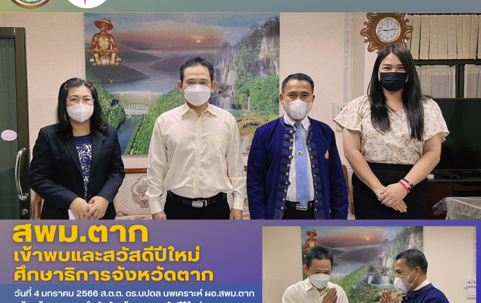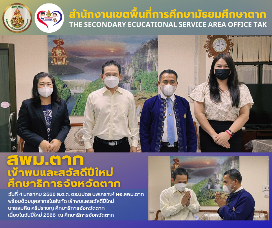 สพม.ตาก เข้าพบและสวัสดีปีใหม่ ศึกษาธิการจังหวัดตาก วรวุฒิ เนื้อนิ่ม 4 มกราคม 2566 วันที่ 4 มกราคม 2566 ส.ต.ต. ดร.นปดล นพเคราะห์ ผอ.สพม.ตาก พร้อมด้วยบุคลากรในสังกัด เข้าพบและสวัสดีปีใหม่ นายสมคิด ศรีปราชญ์ ศึกษาธิการจังหวัดตาก เนื่องในวันปีใหม่ 2566 ณ ศึกษาธิการจังหวัดตาก จำนวนคนดู 2