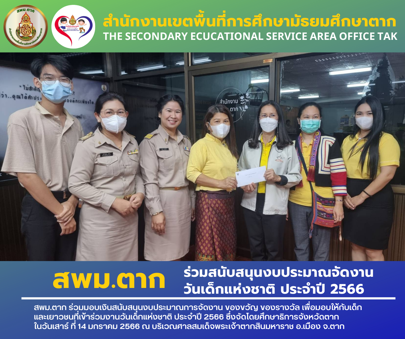 สพม.ตาก ร่วมสนับสนุนงบประมาณจัดงานวันเด็กแห่งชาติ ประจำปี 2566 วรวุฒิ เนื้อนิ่ม 9 มกราคม 2566 สพม.ตาก ร่วมมอบเงินสนับสนุนงบประมาณการจัดงาน ของขวัญ ของรางวัล เพื่อมอบให้กับเด็ก และเยาวชนที่เข้าร่วมงานวันเด็กแห่งชาติ ประจำปี 2566 ซึ่งจัดโดยศึกษาธิการจังหวัดตาก ในวันเสาร์ ที่ 14 มกราคม 2566 ณ บริเวณศาลสมเด็จพระเจ้าตากสินมหาราช อ.เมือง จ.ตาก จำนวนคนดู 22