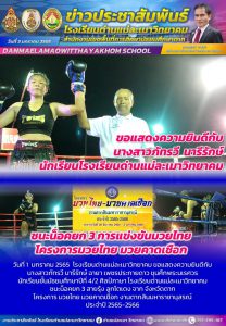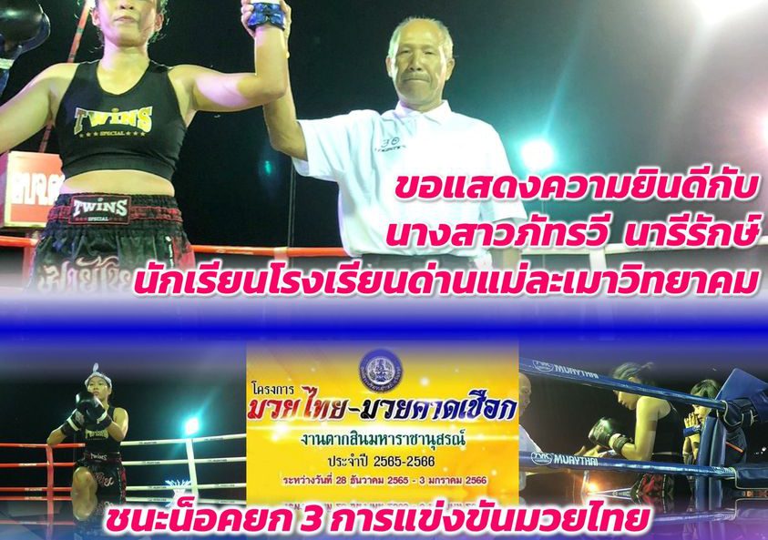 โรงเรียนด่านแม่ละเมาวิทยาคม ขอแสดงความยินดีกับ นางสาวภัทรวี นารีรักษ์ ฉายา เพชรประกายดาว ขุนศึกพระนเรศวร นักเรียนชั้นมัธยมศึกษาปีที่ 4/2 ศิลป์ภาษา โรงเรียนด่านแม่ละเมาวิทยาคม ชนะน็อคยก 3 สายรุ้ง ลูกโตเตง จาก จังหวัดตาก โครงการ มวยไทย มวยคาดเชือก งานตากสินมหาราชานุสรณ์ ประจำปี 2565-2566 หนึ่งฤทัย จีนหน่อ 12 มกราคม 2566 จำนวนคนดู 8