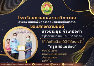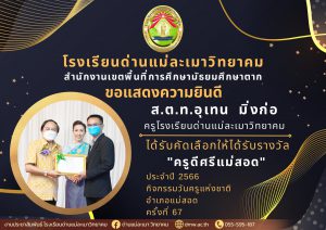 โรงเรียนด่านแม่ละเมาวิทยาคม ขอแสดงความยินดี 1. นางประยูร ก๋าเครือคำ 2. ส.ต.ท.อุเทน มิ่งก่อ ครูโรงเรียนด่านแม่ละเมาวิทยาคม ได้รับคัดเลือกให้ได้รับรางวัล “ครูดีศรีแม่สอด” ประจำปี 2566 กิจกรรมวันครูแห่งชาติ อำเภอแม่สอด ครั้งที่ 67 หนึ่งฤทัย จีนหน่อ 19 มกราคม 2566 จำนวนคนดู 7