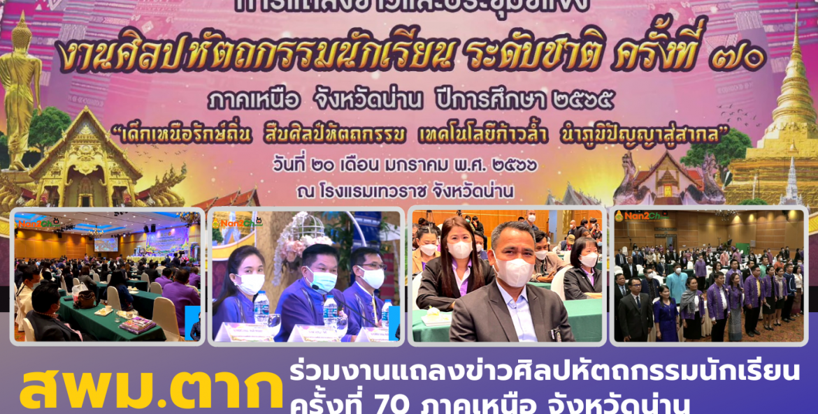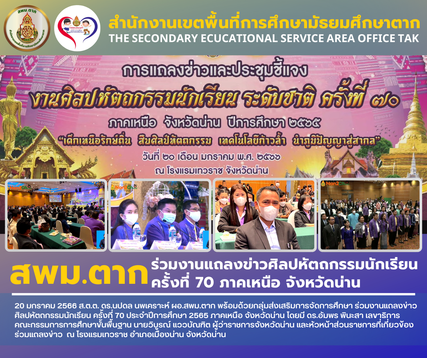 20 มกราคม 2566 ส.ต.ต. ดร.นปดล นพเคราะห์ ผอ.สพม.ตาก พร้อมด้วยกลุ่มส่งเสริมการจัดการศึกษา ร่วมงานแถลงข่าวศิลปหัตถกรรมนักเรียน ครั้งที่ 70 ประจำปีการศึกษา 2565 ภาคเหนือ จังหวัดน่าน โดยมี ดร.อัมพร พินะสา เลขาธิการคณะกรรมการการศึกษาขั้นพื้นฐาน นายวิบูรณ์ แววบัณฑิต ผู้ว่าราชการจังหวัดน่าน และหัวหน้าส่วนราชการที่เกี่ยวข้อง ร่วมแถลงข่าว ณ โรงแรมเทวราช อำเภอเมืองน่าน จังหวัดน่าน