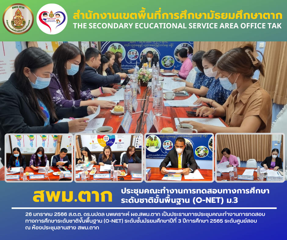 สพม.ตาก ประชุมคณะทำงานการทดสอบทางการศึกษาระดับชาติขั้นพื้นฐาน (O-NET) ม.3 วรวุฒิ เนื้อนิ่ม 26 มกราคม 2566 26 มกราคม 2566 ส.ต.ต. ดร.นปดล นพเคราะห์ ผอ.สพม.ตาก เป็นประธานการประชุมคณะทำงานการทดสอบทางการศึกษาระดับชาติขั้นพื้นฐาน (O-NET) ระดับชั้นมัธยมศึกษาปีที่ 3 ปีการศึกษา 2565 ระดับศูนย์สอบ ณ ห้องประชุมลานสาง สพม.ตาก จำนวนคนดู 2