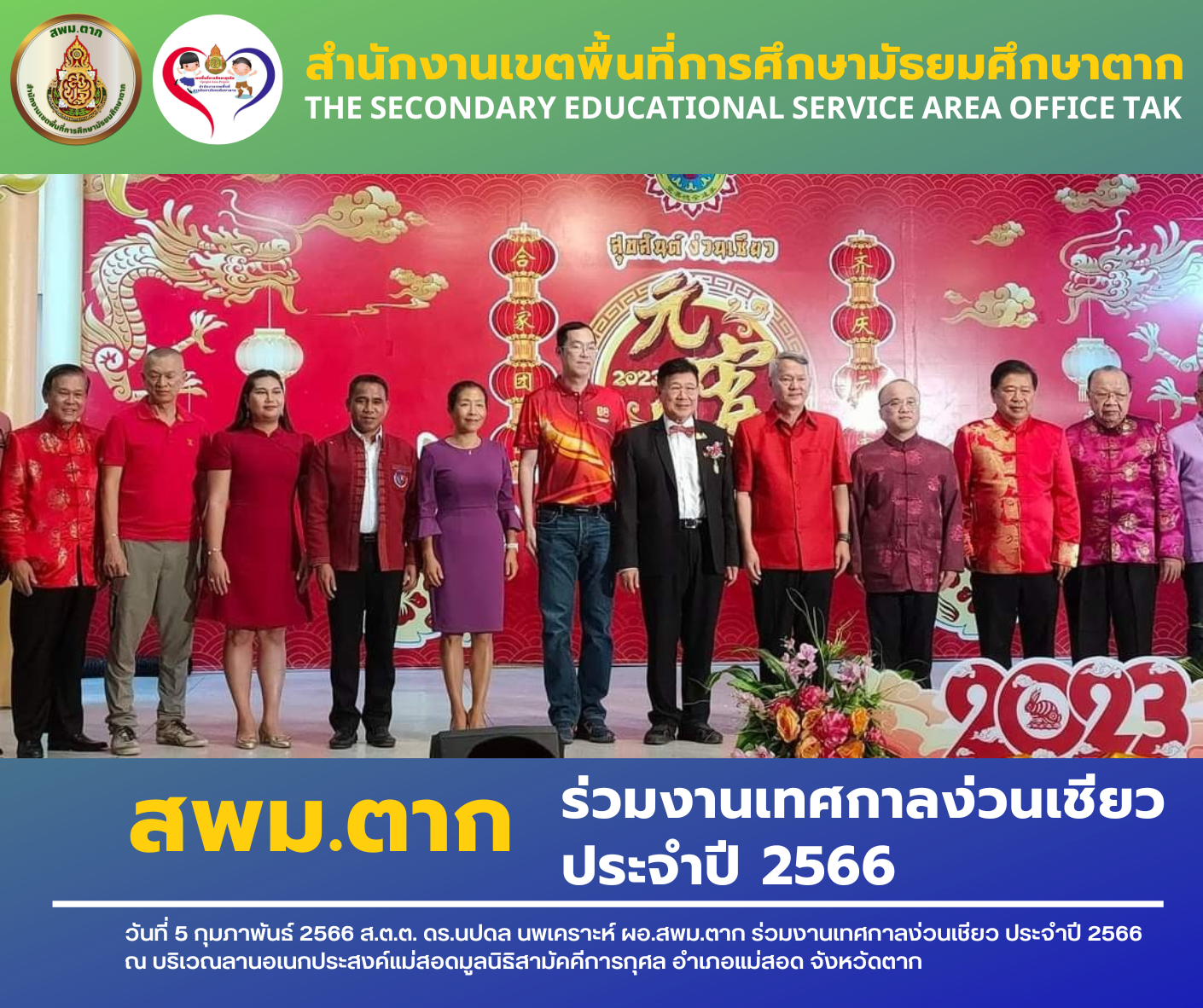 สพม.ตาก ร่วมงานเทศกาลง่วนเชียว ประจำปี 2566 วรวุฒิ เนื้อนิ่ม 6 กุมภาพันธ์ 2566 วันที่ 5 กุมภาพันธ์ 2566 ส.ต.ต. ดร.นปดล นพเคราะห์ ผอ.สพม.ตาก ร่วมงานเทศกาลง่วนเชียว ประจำปี 2566 ณ บริเวณลานอเนกประสงค์แม่สอดมูลนิธิสามัคคีการกุศล อำเภอแม่สอด จังหวัดตาก จำนวนคนดู 21