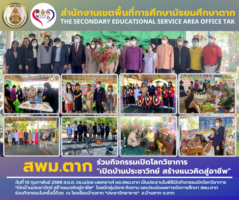 วันที่ 10 กุมภาพันธ์ 2566 ส.ต.ต. ดร.นปดล นพเคราะห์ ผอ.สพม.ตาก เป็นประธานในพิธีเปิดกิจกรรมเปิดโลกวิชาการ “เปิดบ้านประชาวิทย์ สร้างแนวคิดสู่อาชีพ” โดยมีกลุ่มนิเทศ ติดตาม และประเมินผลการจัดการศึกษา สพม.ตาก ร่วมกิจกรรมในครั้งนี้ด้วย ณ โรงเรียนบ้านตาก “ประชาวิทยาคาร” อ.บ้านตาก จ.ตาก