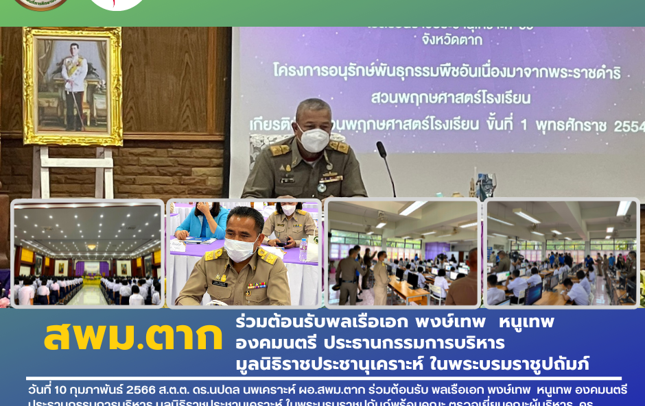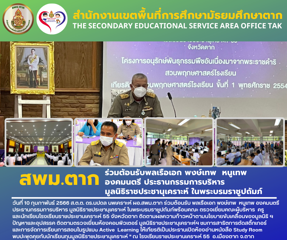 วันที่ 10 กุมภาพันธ์ 2566 ส.ต.ต. ดร.นปดล นพเคราะห์ ผอ.สพม.ตาก ร่วมต้อนรับ พลเรือเอก พงษ์เทพ หนูเทพ องคมนตรี ประธานกรรมการบริหาร มูลนิธิราชประชานุเคราะห์ ในพระบรมราชูปถัมภ์พร้อมคณะ ตรวจเยี่ยมคณะผู้บริหาร ครู และนักเรียนโรงเรียนราชประชานเคราะห์ 55 จังหวัดตาก ติดตามผลความก้าวหน้าตามนโยบายขับเคลื่อนของมูลนิธิ ฯ ปัญหาและอุปสรรค ติดตามตรวจเยี่ยมห้องคอมพิวเตอร์ มูลนิธิราชประชานุเคราะห์ฯ ชมการสาธิตการตัดสติ๊กเกอร์ และการจัดการเรียนการสอนในรูปแบu Active Learning ให้เกียรติเป็นประธานเปิดห้องอ่านหนังสือ Study Room พบปะพุดคุยกับนักเรียนทุนมูลนิธิราชประชานุเคราะห์ ” ณ โรงเรียนราชประชานเคราะห์ 55 อ.เมืองตาก จ.ตาก