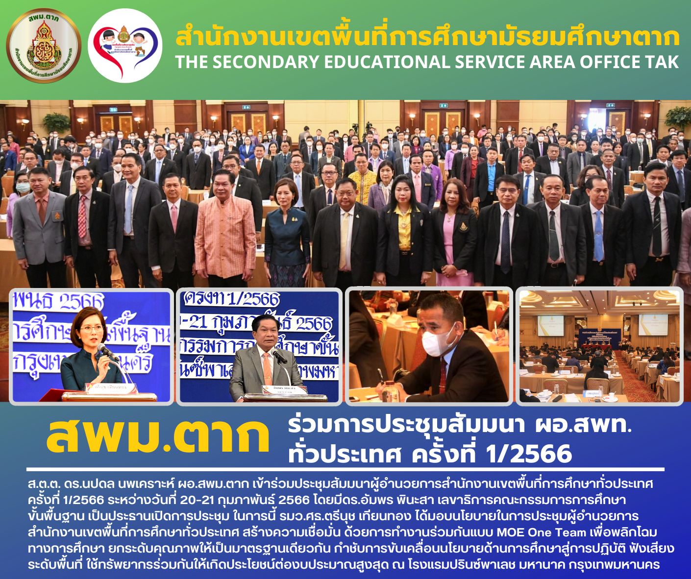 ส.ต.ต. ดร.นปดล นพเคราะห์ ผอ.สพม.ตาก เข้าร่วมประชุมสัมมนาผู้อำนวยการสำนักงานเขตพื้นที่การศึกษาทั่วประเทศ ครั้งที่ 1/2566 ระหว่างวันที่ 20–21 กุมภาพันธ์ 2566 โดยมีดร.อัมพร พินะสา เลขาธิการคณะกรรมการการศึกษา ขั้นพื้นฐาน เป็นประธานเปิดการประชุม ในการนี้ รมว.ศธ.ตรีนุช เทียนทอง ได้มอบนโยบายในการประชุมผู้อำนวยการสำนักงานเขตพื้นที่การศึกษาทั่วประเทศ สร้างความเชื่อมั่น ด้วยการทำงานร่วมกันแบบ MOE One Team เพื่อพลิกโฉมทางการศึกษา ยกระดับคุณภาพให้เป็นมาตรฐานเดียวกัน กำชับการขับเคลื่อนนโยบายด้านการศึกษาสู่การปฏิบัติ ฟังเสียงระดับพื้นที่ ใช้ทรัพยากรร่วมกันให้เกิดประโยชน์ต่องบประมาณสูงสุด ณ โรงแรมปรินซ์พาเลช มหานาค กรุงเทพมหานคร