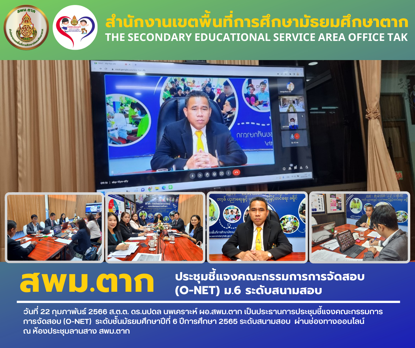 สพม.ตาก ประชุมชี้แจงคณะกรรมการการจัดสอบ (O-NET) ม.6 ระดับสนามสอบ วรวุฒิ เนื้อนิ่ม 22 กุมภาพันธ์ 2566 วันที่ 22 กุมภาพันธ์ 2566 ส.ต.ต. ดร.นปดล นพเคราะห์ ผอ.สพม.ตาก เป็นประธานการประชุมชี้แจงคณะกรรมการ การจัดสอบ (O-NET) ระดับชั้นมัธยมศึกษาปีที่ 6 ปีการศึกษา 2565 ระดับสนามสอบ ผ่านช่องทางออนไลน์ ณ ห้องประชุมลานสาง สพม.ตาก จำนวนคนดู 2