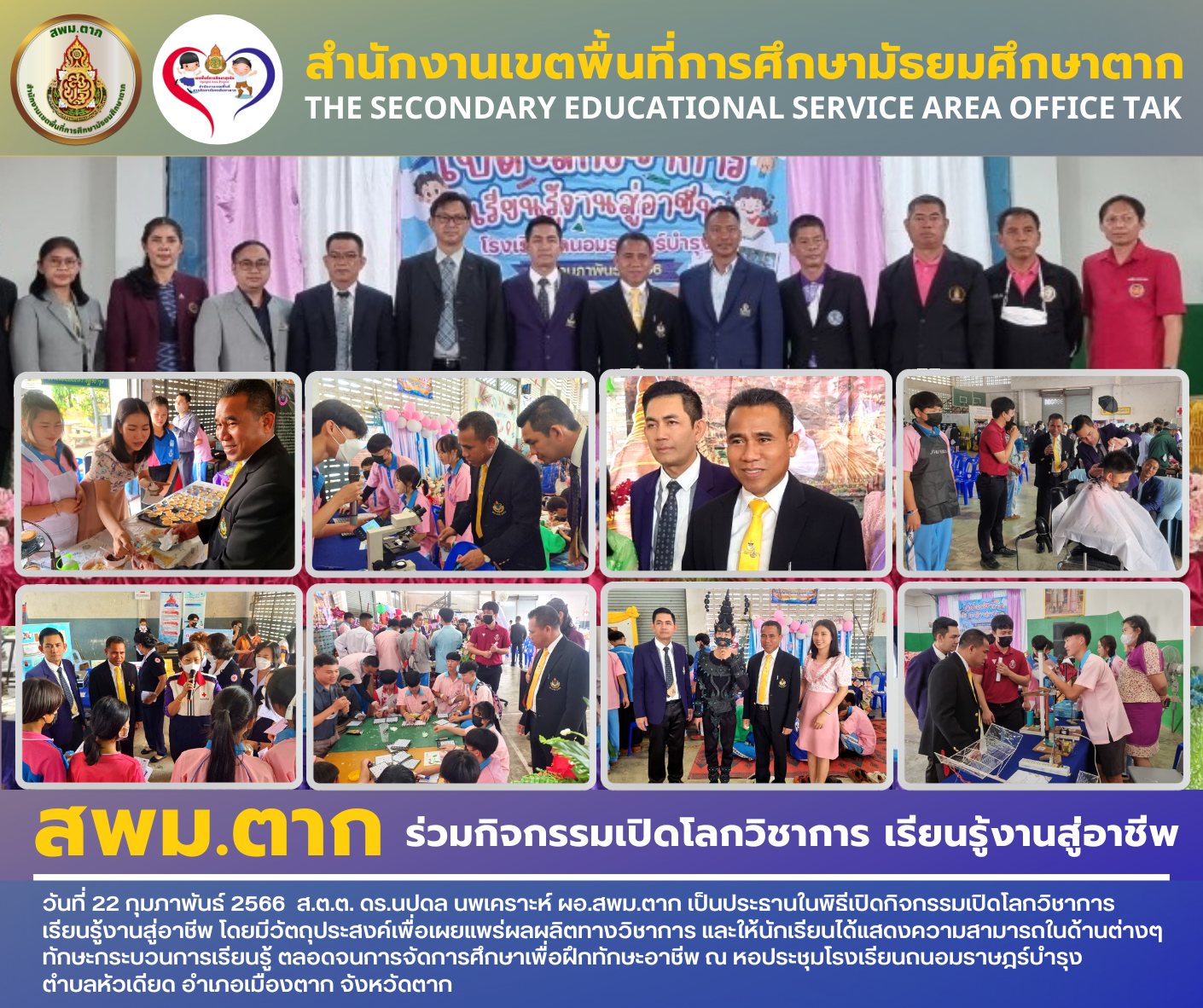 วันที่ 22 กุมภาพันธ์ 2566 ส.ต.ต. ดร.นปดล นพเคราะห์ ผอ.สพม.ตาก เป็นประธานในพิธีเปิดกิจกรรมเปิดโลกวิชาการ เรียนรู้งานสู่อาชีพ โดยมีวัตถุประสงค์เพื่อเผยแพร่ผลผลิตทางวิชาการ และให้นักเรียนได้แสดงความสามารถในด้านต่างๆ ทักษะกระบวนการเรียนรู้ ตลอดจนการจัดการศึกษาเพื่อฝึกทักษะอาชีพ ณ หอประชุมโรงเรียนถนอมราษฎร์บำรุง ตำบลหัวเดียด อำเภอเมืองตาก จังหวัดตาก