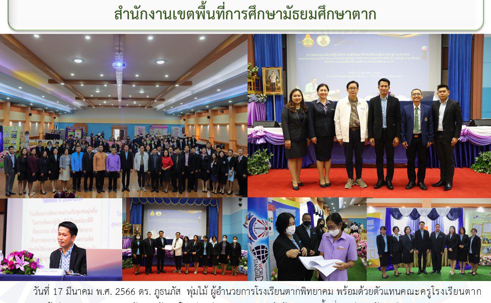 วันที่ 17 มีนาคม พ.ศ. 2566 ดร. ภูธนภัส พุ่มไม้ ผู้อำนวยการโรงเรียนตากพิทยาคม พร้อมด้วยตัวแทนคณะครูโรงเรียนตากพิทยาคม เข้าร่วมการอบรมเชิงปฏิบัติการพัฒนาโรงเรียนสู่มาตรฐานสากล สำนักงานเขตพื้นที่การศึกษามัธยมศึกษาตาก ณ หอประชุมกาญจนาภิเษก 1 โรงเรียนตากพิทยาคม โดยมีอาจารย์ภักดี รัชตวิภาสนันท์ ผู้ทรงคุณวุฒิ สพฐ. ให้เกียรติเป็นวิทยากร ซึ่ง ดร.ภูธนภัส พุ่มไม้ ผู้อำนวยการโรงเรียนตากพิทยาคม เป็นตัวแทนผู้บริหารโรงเรียนที่ผ่านการประเมิน OBECQA นำเสนอนวัตกรรมการบริหารจัดการด้วยระบบคุณภาพของโรงเรียนตากพิทยาคม