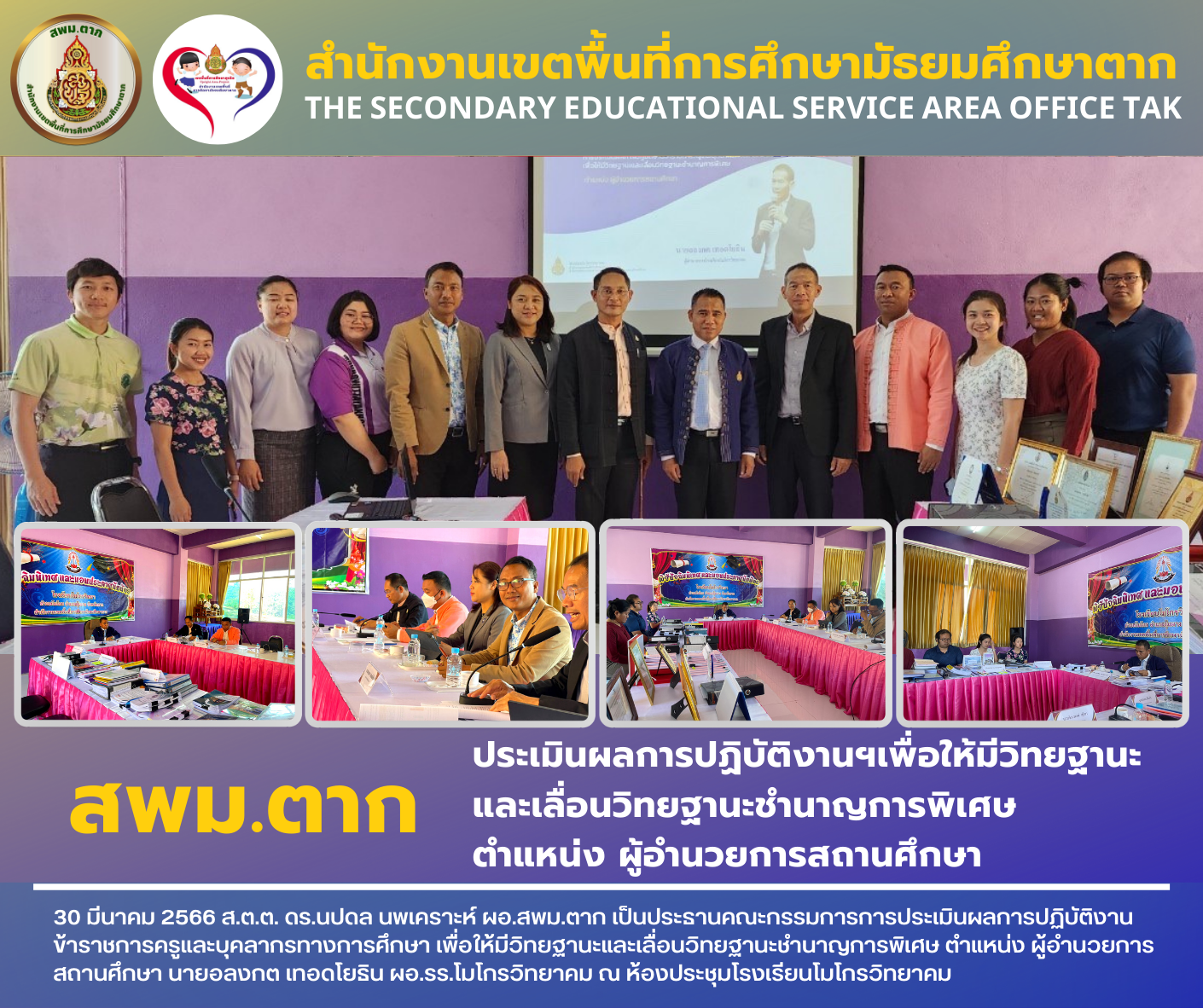30 มีนาคม 2566 ส.ต.ต. ดร.นปดล นพเคราะห์ ผอ.สพม.ตาก เป็นประธานคณะกรรมการการประเมินผลการปฏิบัติงานข้าราชการครูและบุคลากรทางการศึกษา เพื่อให้มีวิทยฐานะและเลื่อนวิทยฐานะชำนาญการพิเศษ ตำแหน่ง ผู้อำนวยการสถานศึกษา นายอลงกต เทอดโยธิน ผอ.รร.โมโกรวิทยาคม ณ ห้องประชุมโรงเรียนโมโกรวิทยาคม
