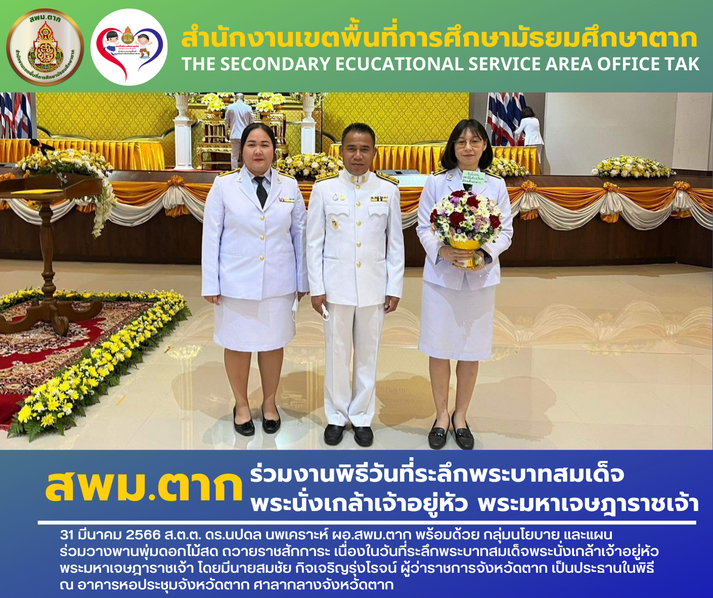 31 มีนาคม 2566 ส.ต.ต. ดร.นปดล นพเคราะห์ ผอ.สพม.ตาก พร้อมด้วย กลุ่มนโยบาย และแผน ร่วมวางพานพุ่มดอกไม้สด ถวายราชสักการะ เนื่องในวันที่ระลึกพระบาทสมเด็จพระนั่งเกล้าเจ้าอยู่หัว พระมหาเจษฎาราชเจ้า โดยมีนายสมชัย กิจเจริญรุ่งโรจน์ ผู้ว่าราชการจังหวัดตาก เป็นประธานในพิธี ณ อาคารหอประชุมจังหวัดตาก ศาลากลางจังหวัดตาก