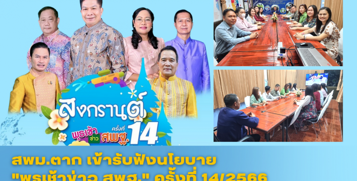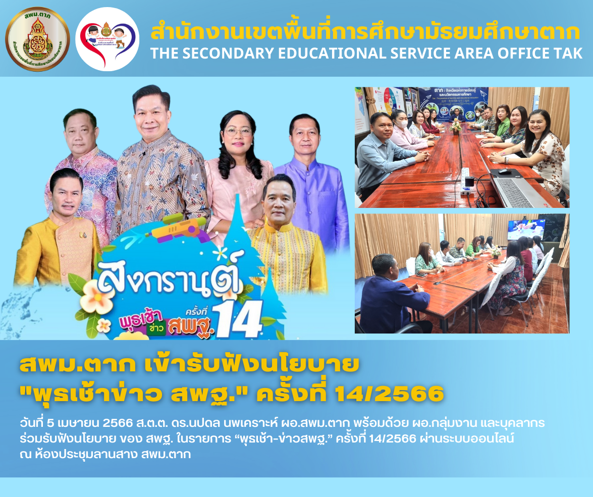 สพม.ตาก เข้ารับฟังนโยบาย “พุธเช้าข่าว สพฐ.” ครั้งที่ 14/2566 วรวุฒิ เนื้อนิ่ม 11 เมษายน 2566 วันที่ 5 เมษายน 2566 ส.ต.ต. ดร.นปดล นพเคราะห์ ผอ.สพม.ตาก พร้อมด้วย ผอ.กลุ่มงาน และบุคลากร ร่วมรับฟังนโยบาย ของ สพฐ. ในรายการ “พุธเช้า–ข่าวสพฐ.” ครั้งที่ 14/2566 ผ่านระบบออนไลน์ ณ ห้องประชุมลานสาง สพม.ตาก จำนวนคนดู 2