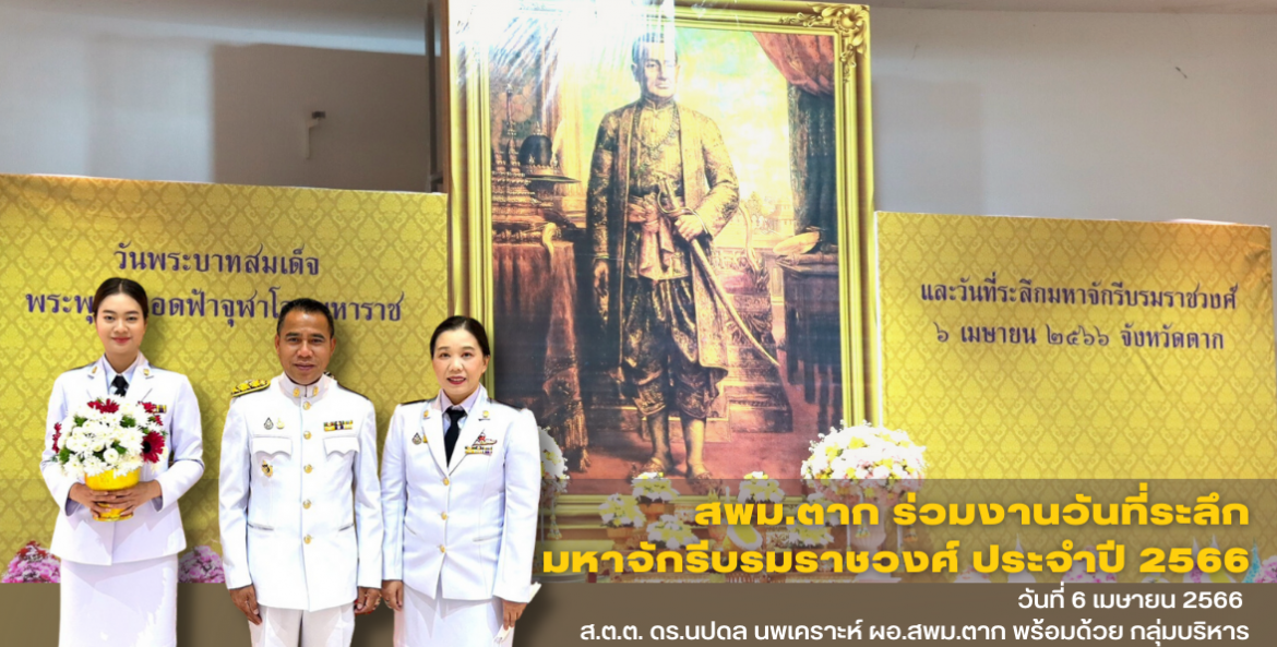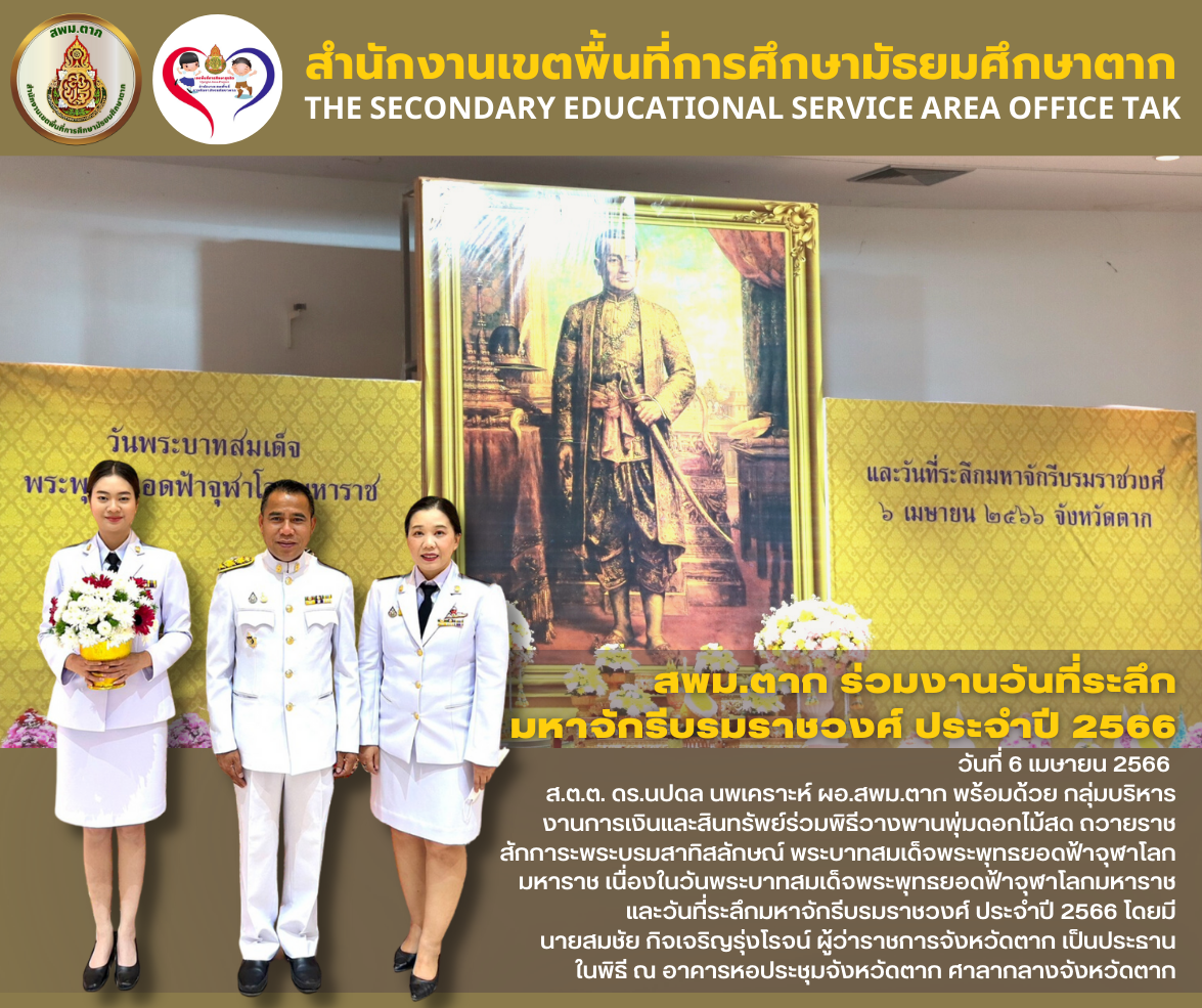 วันที่ 6 เมษายน 2566 ส.ต.ต. ดร.นปดล นพเคราะห์ ผอ.สพม.ตาก พร้อมด้วย กลุ่มบริหารงานการเงินและสินทรัพย์ร่วมพิธีวางพานพุ่มดอกไม้สด ถวายราช สักการะพระบรมสาทิสลักษณ์ พระบาทสมเด็จพระพุทธยอดฟ้าจุฬาโลกมหาราช เนื่องในวันพระบาทสมเด็จพระพุทธยอดฟ้าจุฬาโลกมหาราช และวันที่ระลึกมหาจักรีบรมราชวงศ์ ประจำปี 2566 โดยมี นายสมชัย กิจเจริญรุ่งโรจน์ ผู้ว่าราชการจังหวัดตาก เป็นประธาน ในพิธี ณ อาคารหอประชุมจังหวัดตาก ศาลากลางจังหวัดตาก