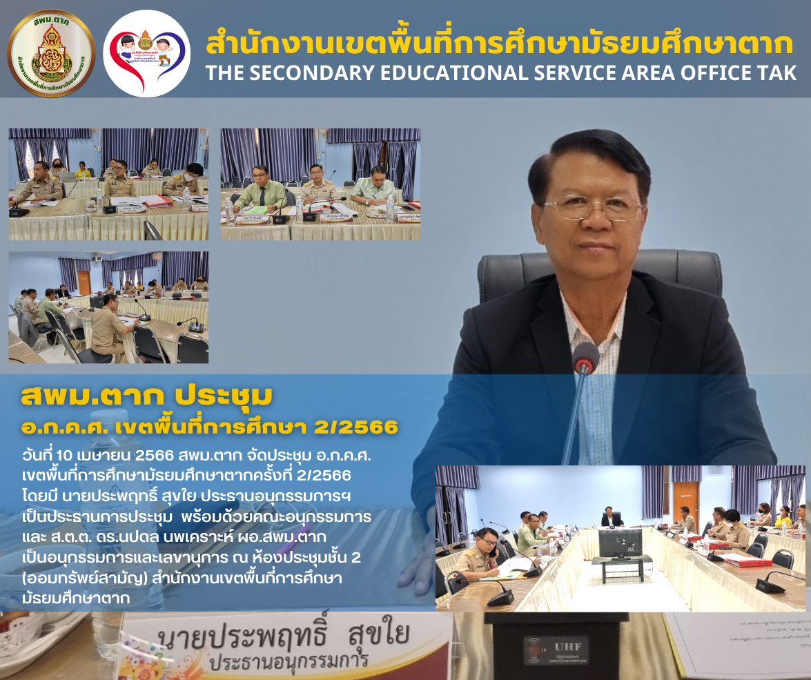 วันที่ 10 เมษายน 2566 สพม.ตาก จัดประชุม อ.ก.ค.ศ. เขตพื้นที่การศึกษามัธยมศึกษาตากครั้งที่ 2/2566 โดยมี นายประพฤทธิ์ สุขใย ประธานอนุกรรมการฯ เป็นประธานการประชุม พร้อมด้วยคณะอนุกรรมการ และ ส.ต.ต. ดร.นปดล นพเคราะห์ ผอ.สพม.ตาก เป็นอนุกรรมการและเลขานุการ ณ ห้องประชุมชั้น 2 (ออมทรัพย์สามัญ) สำนักงานเขตพื้นที่การศึกษามัธยมศึกษาตาก