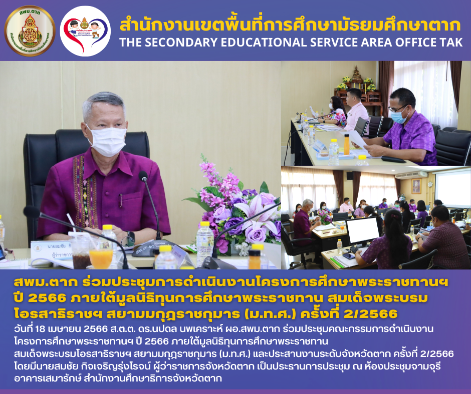 วันที่ 18 เมษายน 2566 ส.ต.ต. ดร.นปดล นพเคราะห์ ผอ.สพม.ตาก ร่วมประชุมคณะกรรมการดำเนินงานโครงการศึกษาพระราชทานฯ ปี 2566 ภายใต้มูลนิธิทุนการศึกษาพระราชทาน สมเด็จพระบรมโอรสาธิราชฯ สยามมกุฎราชกุมาร (ม.ท.ศ.) และประสานงานระดับจังหวัดตาก ครั้งที่ 2/2566 โดยมีนายสมชัย กิจเจริญรุ่งโรจน์ ผู้ว่าราชการจังหวัดตาก เป็นประธานการประชุม ณ ห้องประชุมจามจุรี อาคารเสมารักษ์ สำนักงานศึกษาธิการจังหวัดตาก