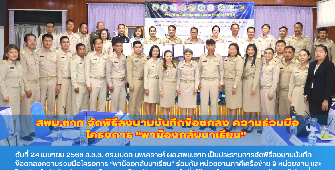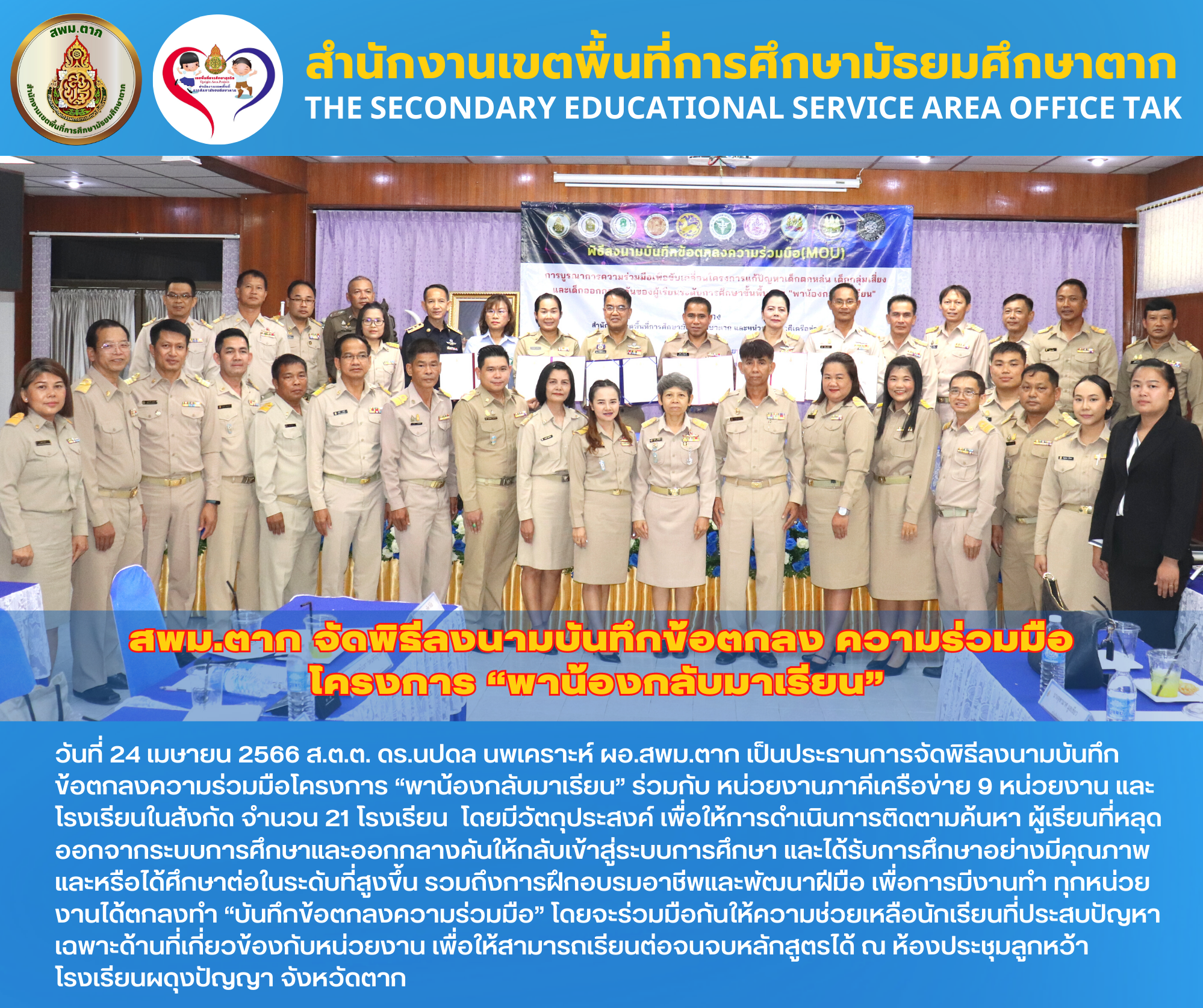 วันที่ 24 เมษายน 2566 ส.ต.ต. ดร.นปดล นพเคราะห์ ผอ.สพม.ตาก เป็นประธานการจัดพิธีลงนามบันทึก ข้อตกลงความร่วมมือโครงการ “พาน้องกลับมาเรียน” ร่วมกับ หน่วยงานภาคีเครือข่าย 9 หน่วยงาน และ โรงเรียนในสังกัด จำนวน 21 โรงเรียน โดยมีวัตถุประสงค์ เพื่อให้การดำเนินการติดตามค้นหา ผู้เรียนที่หลุดออกจากระบบการศึกษาและออกกลางคันให้กลับเข้าสู่ระบบการศึกษา และได้รับการศึกษาอย่างมีคุณภาพ และหรือได้ศึกษาต่อในระดับที่สูงขึ้น รวมถึงการฝึกอบรมอาชีพและพัฒนาฝีมือ เพื่อการมีงานทำ ทุกหน่วยงานได้ตกลงทำ “บันทึกข้อตกลงความร่วมมือ” โดยจะร่วมมือกันให้ความช่วยเหลือนักเรียนที่ประสบปัญหาเฉพาะด้านที่เกี่ยวข้องกับหน่วยงาน เพื่อให้สามารถเรียนต่อจนจบหลักสูตรได้ ณ ห้องประชุมลูกหว้า โรงเรียนผดุงปัญญา จังหวัดตาก