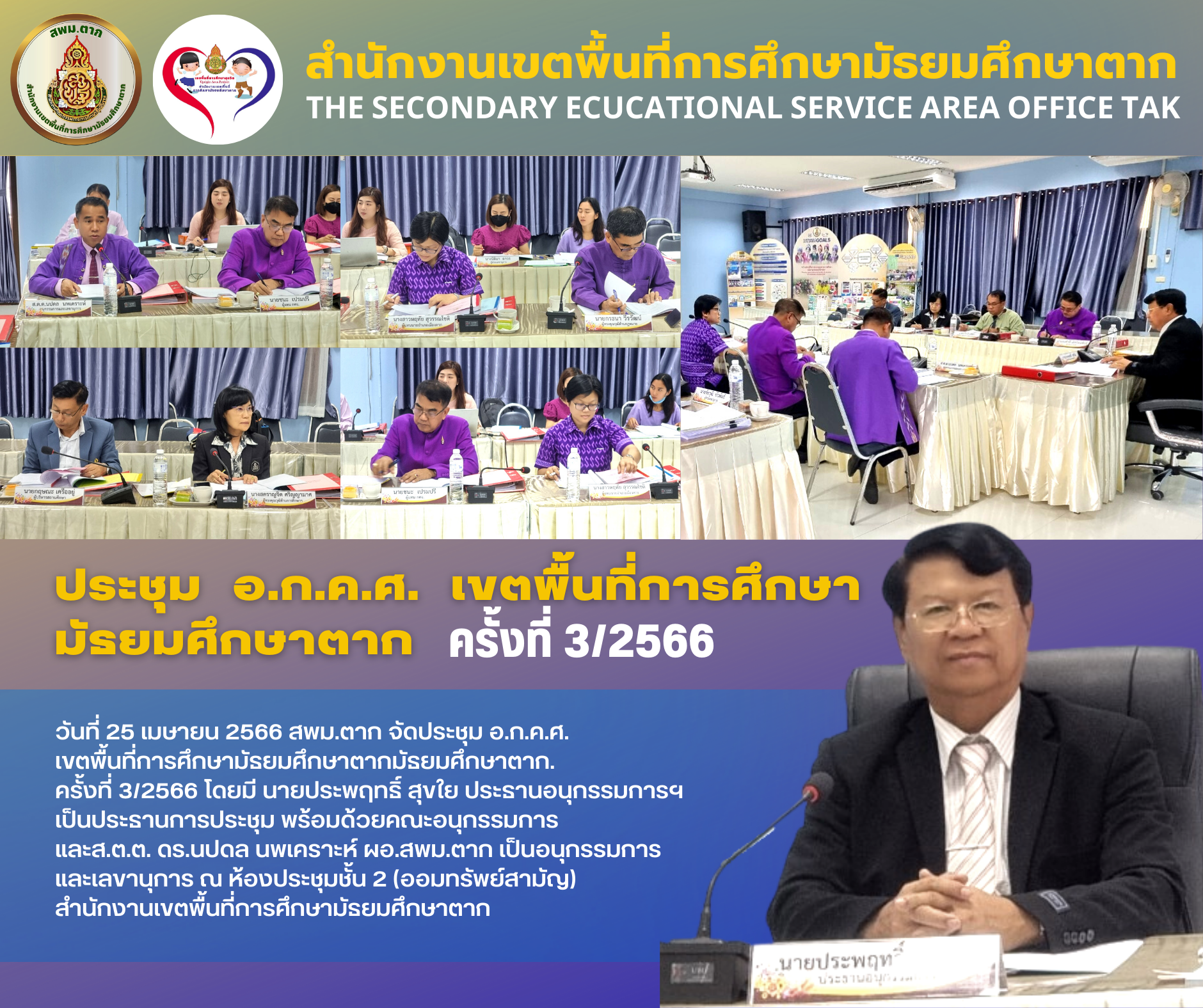 วันที่ 25 เมษายน 2566 สพม.ตาก จัดประชุม อ.ก.ค.ศ. เขตพื้นที่การศึกษามัธยมศึกษาตากมัธยมศึกษาตาก. ครั้งที่ 3/2566 โดยมี นายประพฤทธิ์ สุขใย ประธานอนุกรรมการฯ เป็นประธานการประชุม พร้อมด้วยคณะอนุกรรมการ และส.ต.ต. ดร.นปดล นพเคราะห์ ผอ.สพม.ตาก เป็นอนุกรรมการ และเลขานุการ ณ ห้องประชุมชั้น 2 (ออมทรัพย์สามัญ) สำนักงานเขตพื้นที่การศึกษามัธยมศึกษาตาก