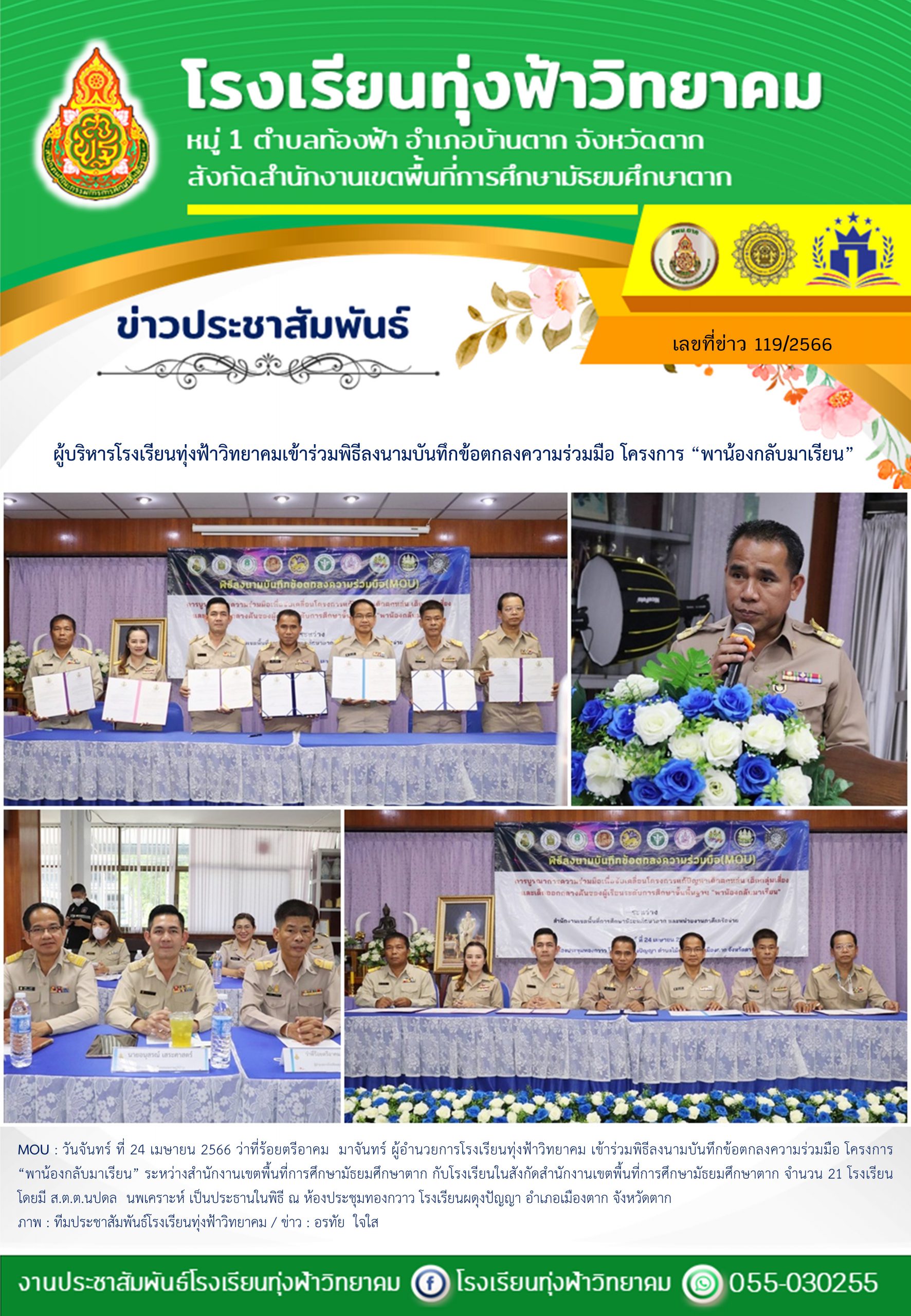 MOU : วันจันทร์ ที่ 24 เมษายน 2566 ว่าที่ร้อยตรีอาคม มาจันทร์ ผู้อำนวยการโรงเรียนทุ่งฟ้าวิทยาคม เข้าร่วมพิธีลงนามบันทึกข้อตกลงความร่วมมือ โครงการ “พาน้องกลับมาเรียน” ระหว่างสำนักงานเขตพื้นที่การศึกษามัธยมศึกษาตาก กับโรงเรียนในสังกัดสำนักงานเขตพื้นที่การศึกษามัธยมศึกษาตาก จำนวน 21 โรงเรียน โดยมี ส.ต.ต.นปดล นพเคราะห์ เป็นประธานในพิธี ณ ห้องประชุมทองกวาว โรงเรียนผดุงปัญญา อำเภอเมืองตาก จังหวัดตาก