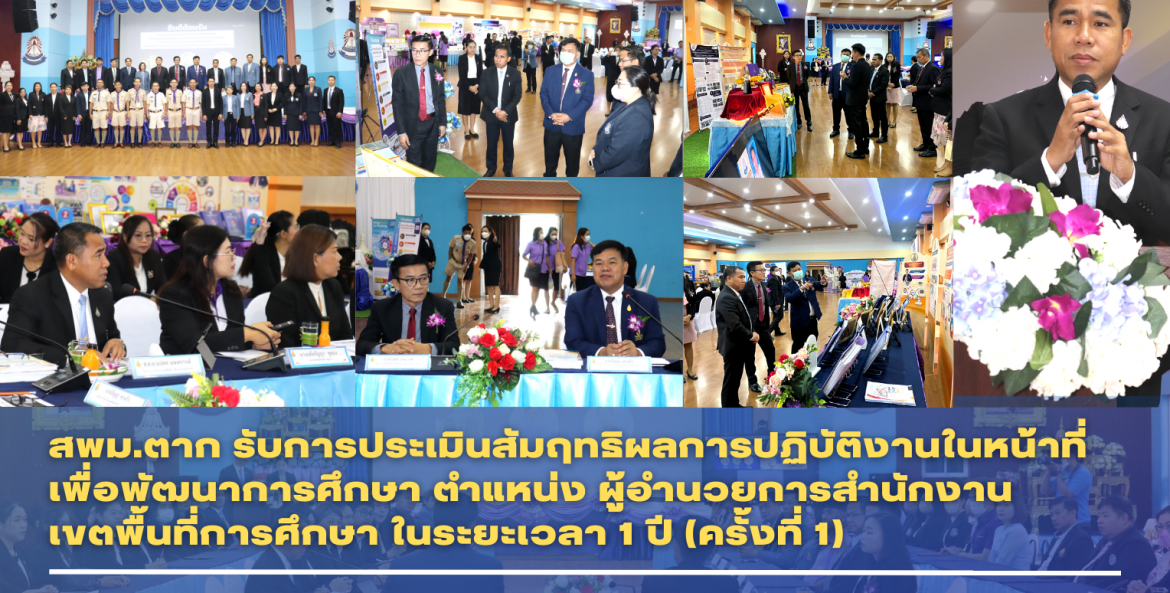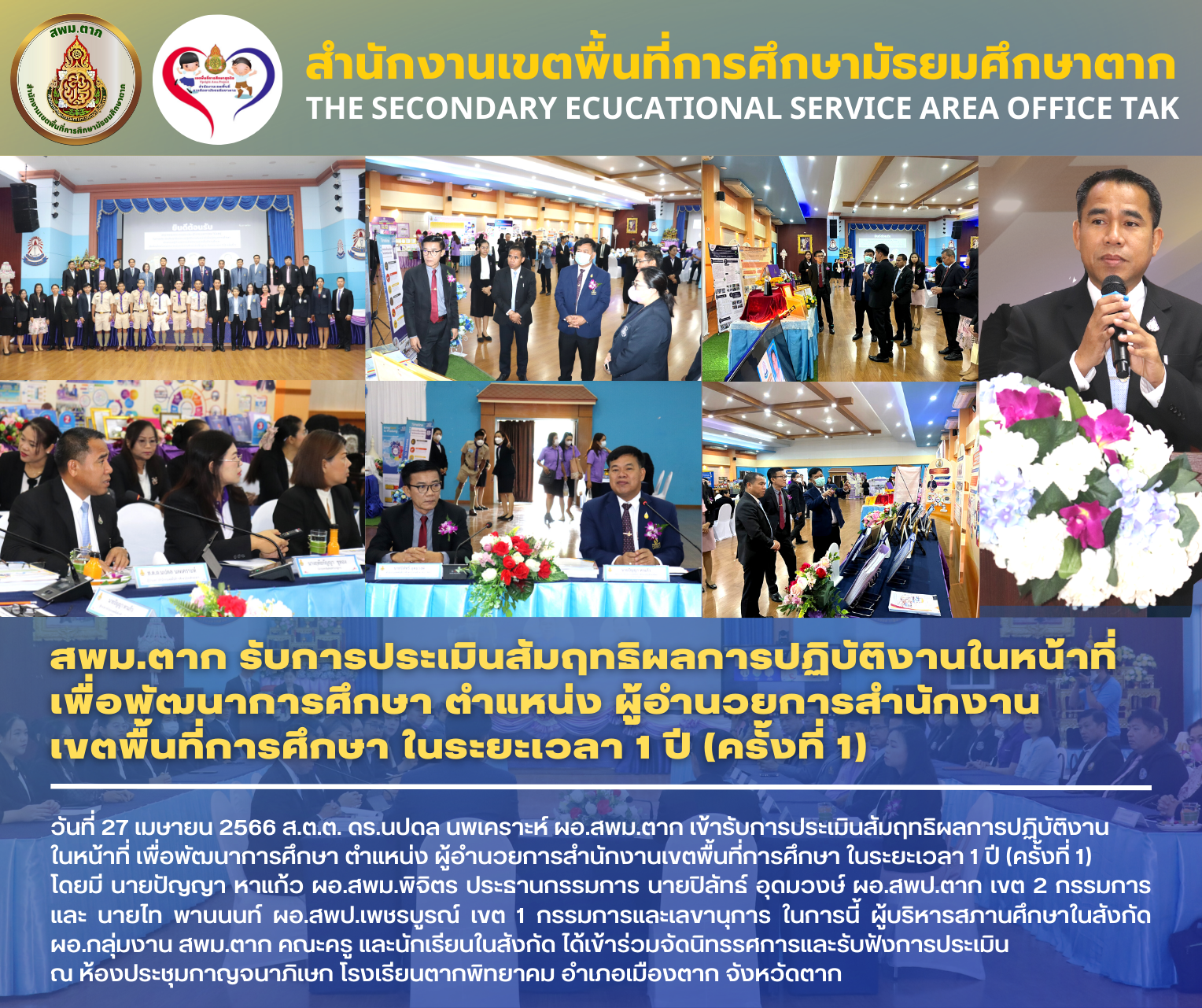 วันที่ 27 เมษายน 2566 ส.ต.ต. ดร.นปดล นพเคราะห์ ผอ.สพม.ตาก เข้ารับการประเมินสัมฤทธิผลการปฏิบัติงาน ในหน้าที่ เพื่อพัฒนาการศึกษา ตำแหน่ง ผู้อำนวยการสำนักงานเขตพื้นที่การศึกษา ในระยะเวลา 1 ปี (ครั้งที่ 1) โดยมี นายปัญญา หาแก้ว ผอ.สพม.พิจิตร ประธานกรรมการ นายปิลัทธ์ อุดมวงษ์ ผอ.สพป.ตาก เขต 2 กรรมการ และ นายไท พานนนท์ ผอ.สพป.เพชรบูรณ์ เขต 1 กรรมการและเลขานุการ ในการนี้ ผู้บริหารสภานศึกษาในสังกัด ผอ.กลุ่มงาน สพม.ตาก คณะครู และนักเรียนในสังกัด ได้เข้าร่วมจัดนิทรรศการและรับฟังการประเมิน ณ ห้องประชุมกาญจนาภิเษก โรงเรียนตากพิทยาคม อำเภอเมืองตาก จังหวัดตาก