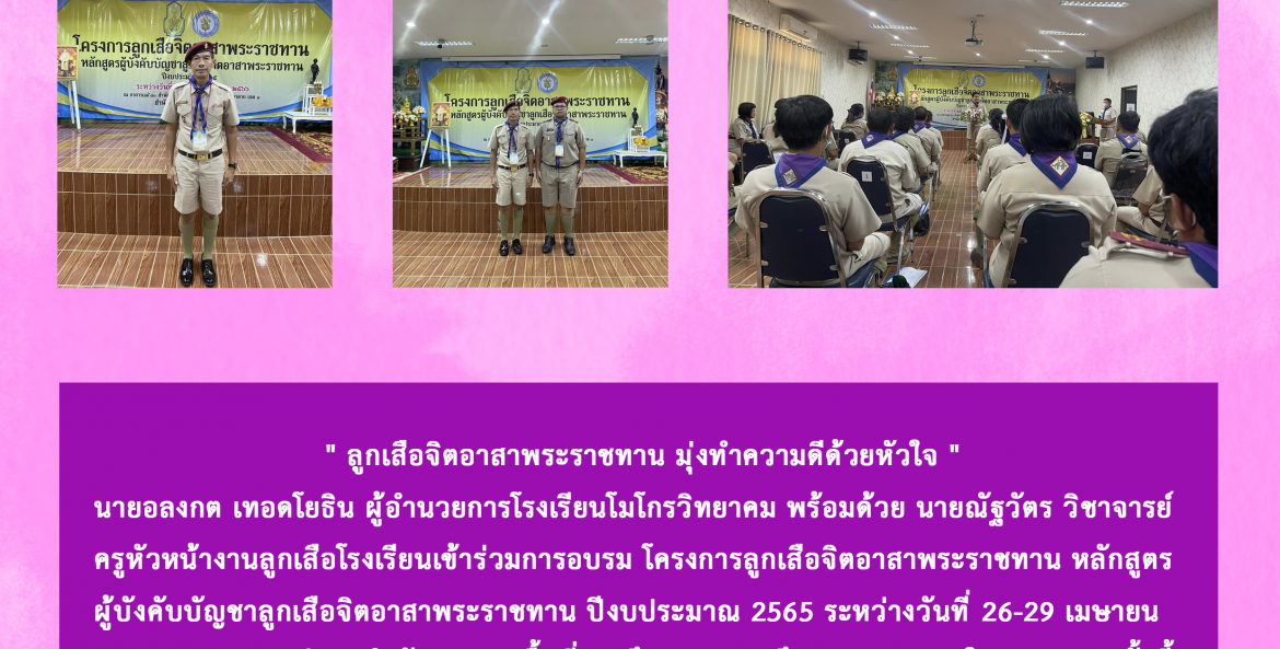 “ลูกเสือจิตอาสาพระราชทาน มุ่งทำความดีด้วยหัวใจ” นายอลงกต เทอดโยธิน ผู้อำนวยการโรงเรียนโมโกรวิทยาคม พร้อมด้วย นายณัฐวัตร วิชาจารย์ ครูหัวหน้างานลูกเสือโรงเรียนเข้าค่วมการอบรม โครงการ ลูกเสือจิตอาสาพระราชทาน หลักสูตรผู้บังคับบัญชาลูกเสือจิตอาสาพระราชทาน ปีงบประมาณ 2565 ระหว่างวันที่ 26-29 เมษายน 2566 ณ อาคารแม่’80 สำนักงานเขตพื้นที่การศึกษาประถมศึกษาตาก เขต1 ในการอบรมครั้งนี้ มีวัตถุประสงค์ เพื่อจัดตั้งหน่วยลูกเสือจิตอาสาพระราชทานในโรงเรียน และพัฒนาต่อยอด ขยายผลลงสู่ลูกเสือ เนตรนารีในโรงเรียนให้เป็นคนมีจิตใจในการอาสาเพื่อพัฒนาพร้อมให้บริการในส่วนรวม