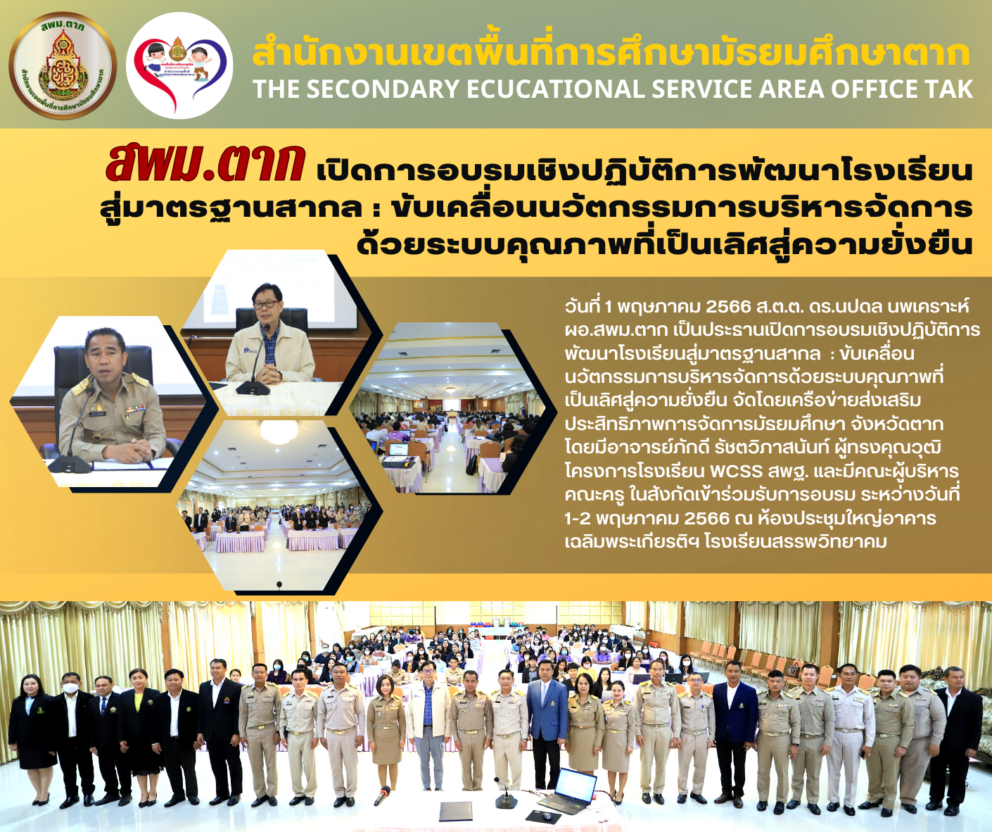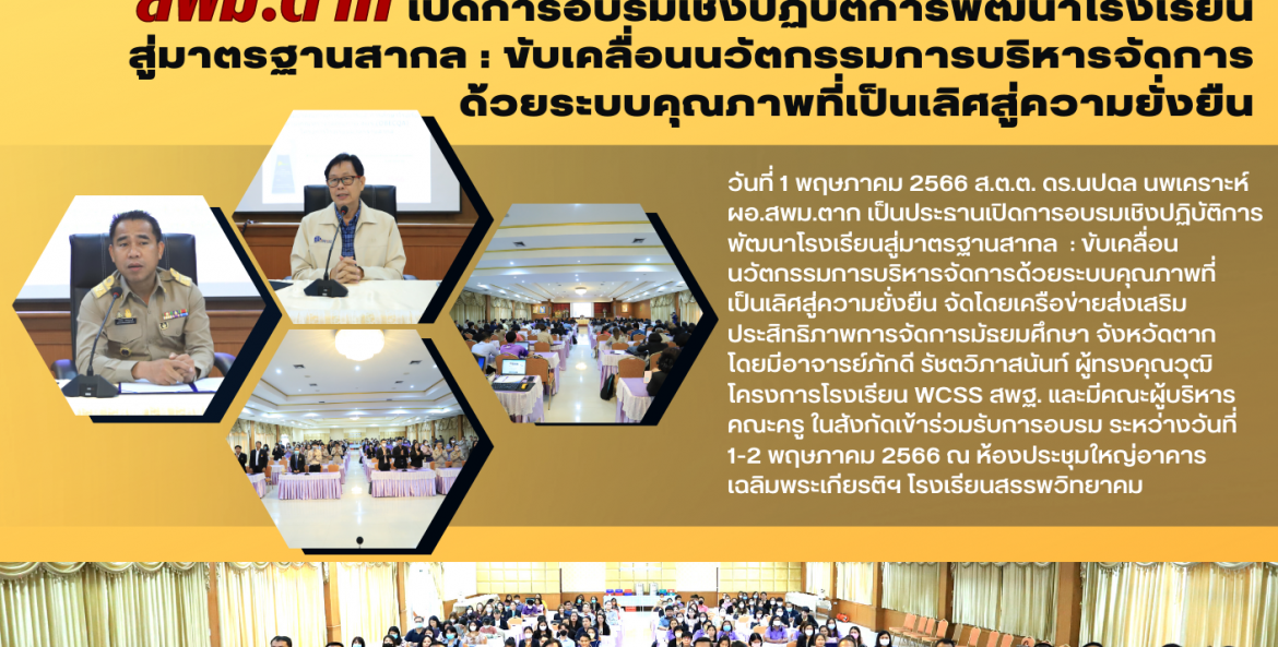 วันที่ 1 พฤษภาคม 2566 ส.ต.ต. ดร.นปดล นพเคราะห์ ผอ.สพม.ตาก เป็นประธานเปิดการอบรมเชิงปฏิบัติการพัฒนาโรงเรียนสู่มาตรฐานสากล : ขับเคลื่อนนวัตกรรมการบริหารจัดการด้วยระบบคุณภาพที่ เป็นเลิศสู่ความยั่งยืน จัดโดยเครือข่ายส่งเสริมประสิทธิภาพการจัดการมัธยมศึกษา จังหวัดตาก โดยมีอาจารย์ภักดี รัชตวิภาสนันท์ ผู้ทรงคุณวุฒิ โครงการโรงเรียน WCSS สพฐ. และมีคณะผู้บริหาร คณะครู ในสังกัดเข้าร่วมรับการอบรม ระหว่างวันที่ 1-2 พฤษภาคม 2566 ณ ห้องประชุมใหญ่อาคารเฉลิมพระเกียรติฯ โรงเรียนสรรพวิทยาคม ขอบคุณภาพจาก สรรพวิทยาคม https://drive.google.com/drive/folders/1-SzI0GYBMsWHjTMzolwB9i-jED-0Tfhh