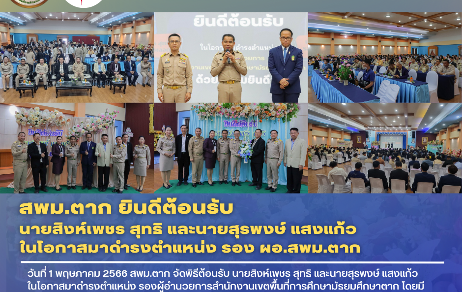 วันที่ 1 พฤษภาคม 2566 สพม.ตาก จัดพิธีต้อนรับ นายสิงห์เพชร สุทธิ และนายสุรพงษ์ แสงแก้ว ในโอกาสมาดำรงตำแหน่ง รองผู้อำนวยการสำนักงานเขตพื้นที่การศึกษามัธยมศึกษาตาก โดยมี ส.ต.ต. ดร.นปดล นพเคราะห์ ผอ.สพม.ตาก พร้อมด้วยหัวหน้าส่วนราชการ ผู้บริหารการศึกษาผู้บริหารสถานศึกษา คณะครู และบุคลากรทางการศึกษา ร่วมแสดงความยินดี ณ หอประชุมกาญจนาภิเษก โรงเรียนตากพิทยาคม