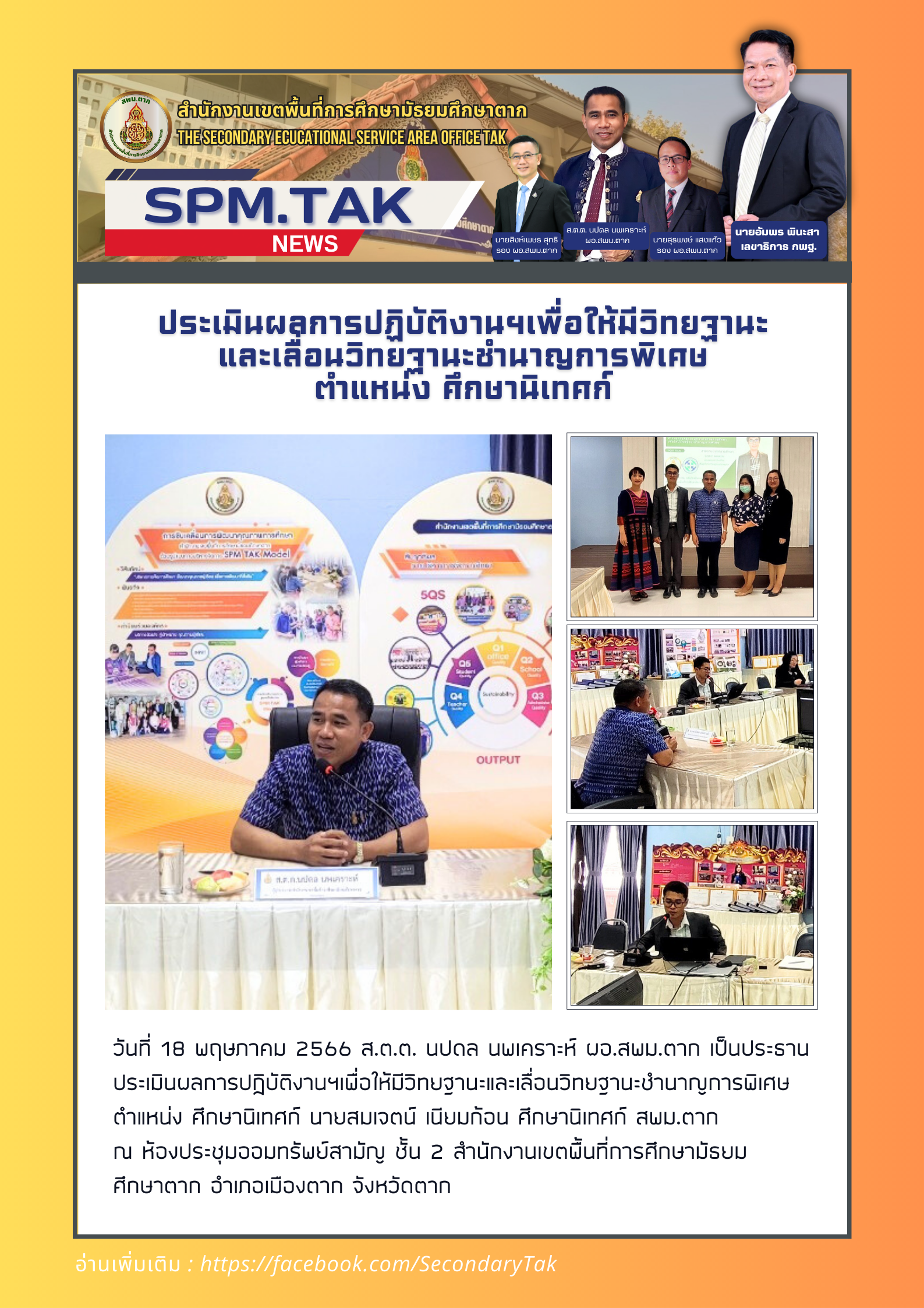 วันที่ 18 พฤษภาคม 2566 ส.ต.ต. นปดล นพเคราะห์ ผอ.สพม.ตาก เป็นประธาน ประเมินผลการปฏิบัติงานฯเพื่อให้มีวิทยฐานะและเลื่อนวิทยฐานะชำนาญการพิเศษ ตำแหน่ง ศึกษานิเทศก์ นายสมเจตน์ เนียมก้อน ศึกษานิเทศก์ สพม.ตาก ณ ห้องประชุมออมทรัพย์สามัญ ชั้น 2 สำนักงานเขตพื้นที่การศึกษามัธยม ศึกษาตาก อำเภอเมืองตาก จังหวัดตาก