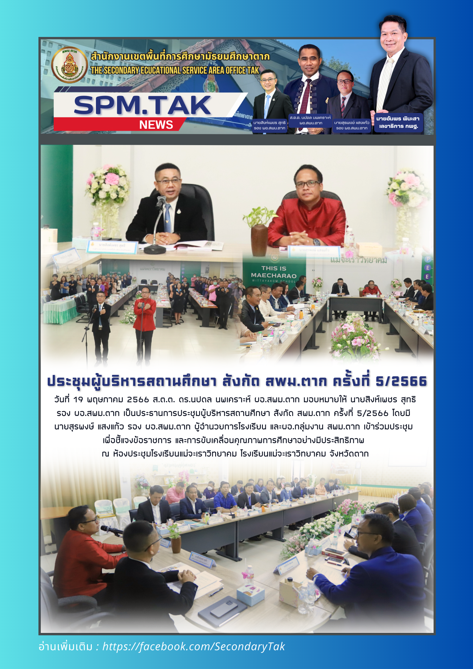 วันที่ 19 พฤษภาคม 2566 ส.ต.ต. ดร.นปดล นพเคราะห์ ผอ.สพม.ตาก มอบหมายให้ นายสิงห์เพชร สุทธิ รอง ผอ.สพม.ตาก เป็นประธานการประชุมผู้บริหารสถานศึกษา สังกัด สพม.ตาก ครั้งที่ 5/2566 โดยมี นายสุรพงษ์ แสงแก้ว รอง ผอ.สพม.ตาก ผู้อำนวยการโรงเรียน และผอ.กลุ่มงาน สพม.ตาก เข้าร่วมประชุม เพื่อชี้แจงข้อราชการ และการขับเคลื่อนคุณภาพการศึกษาอย่างมีประสิทธิภาพ ณ ห้องประชุมโรงเรียนแม่จะเราวิทยาคม โรงเรียนแม่จะเราวิทยาคม จังหวัดตาก