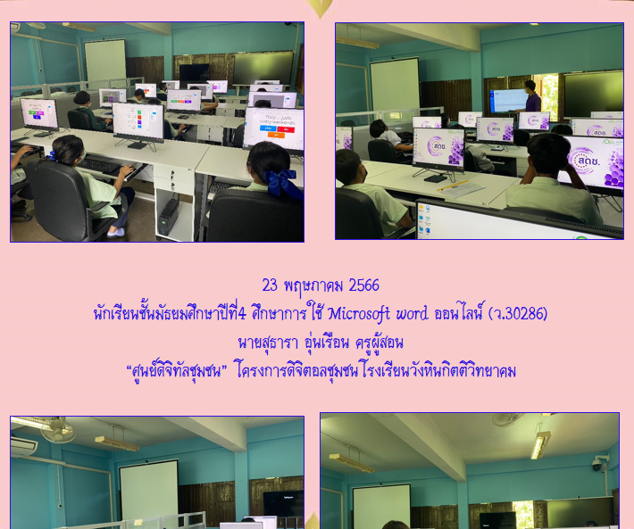 โครงการดิจิตอลชุมชนโรงเรียนวังหินกิตติวิทยาคม ทิพาพร เมืองครอง 23 พฤษภาคม 2566 นักเรียนชั้นมัธยมศึกษาปีที่4 ศึกษาการใช้ Microsoft word ออนไลน์ (ว.30286) นายสุธารา อุ่นเรือน ครูผู้สอน “ศูนย์ดิจิทัลชุมชน” โครงการดิจิตอลชุมชนโรงเรียนวังหินกิตติวิทยาคม จำนวนคนดู 6