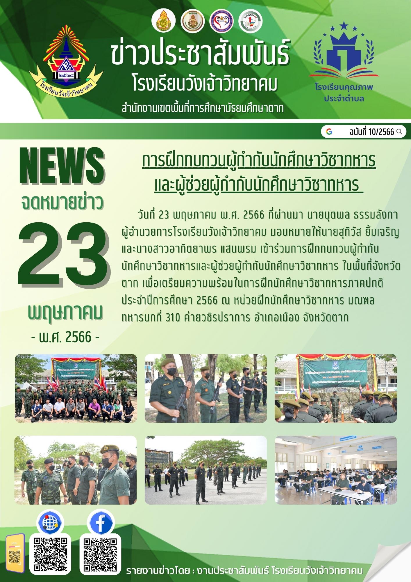 วันที่ 23 พฤษภาคม พ.ศ. 2566 ที่ผ่านมา นายนุตพล ธรรมลังกา ผู้อำนวยการโรงเรียนวังเจ้าวิทยาคม มอบหมายให้นายสุทิวัส ยิ้มเจริญ และนางสาวอาทิตยาพร แสนพรม เข้าร่วมการฝึกทบทวนผู้กำกับนักศึกษาวิชาทหารและผู้ช่วยผู้กำกับนักศึกษาวิชาทหาร ในพื้นที่จังหวัดตาก เพื่อเตรียมความพร้อมในการฝึกนักศึกษาวิชาทหารภาคปกติ ประจำปีการศึกษา 2566 ณ หน่วยฝึกนักศึกษาวิชาทหาร มณฑลทหารบกที่ 310 ค่ายวชิรปราการ อำเภอเมือง จังหวัดตาก