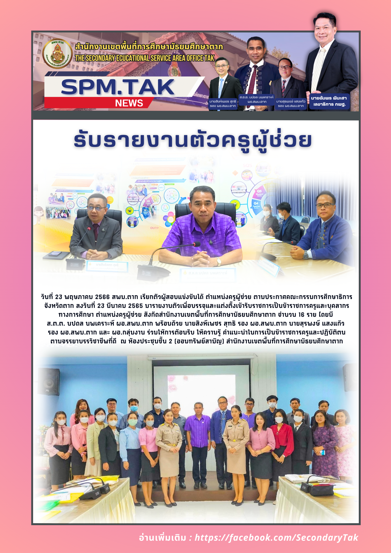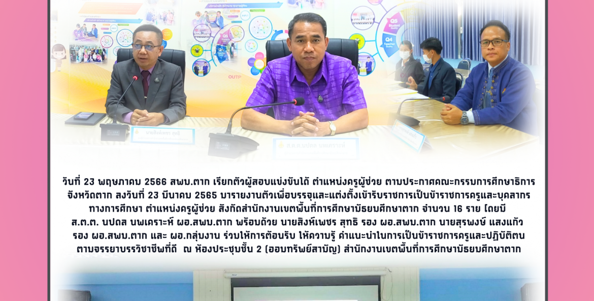 วันที่ 23 พฤษภาคม 2566 สพม.ตาก เรียกตัวผู้สอบแข่งขันได้ ตำแหน่งครูผู้ช่วย ตามประกาศคณะกรรมการศึกษาธิการจังหวัดตาก ลงวันที่ 23 มีนาคม 2565 มารายงานตัวเพื่อบรรจุและแต่งตั้งเข้ารับราชการเป็นข้าราชการครูและบุคลากรทางการศึกษา ตำแหน่งครูผู้ช่วย สังกัดสำนักงานเขตพื้นที่การศึกษามัธยมศึกษาตาก จำนวน 16 ราย โดยมี ส.ต.ต. นปดล นพเคราะห์ ผอ.สพม.ตาก พร้อมด้วย นายสิงห์เพชร สุทธิ รอง ผอ.สพม.ตาก นายสุรพงษ์ แสงแก้ว รอง ผอ.สพม.ตาก และ ผอ.กลุ่มงาน ร่วมให้การต้อนรับ ให้ความรู้ คำแนะนำในการเป็นข้าราชการครูและปฏิบัติตน ตามจรรยาบรรวิชาชีพที่ดี ณ ห้องประชุมชั้น 2 (ออมทรัพย์สามัญ) สำนักงานเขตพื้นที่การศึกษามัธยมศึกษาตาก