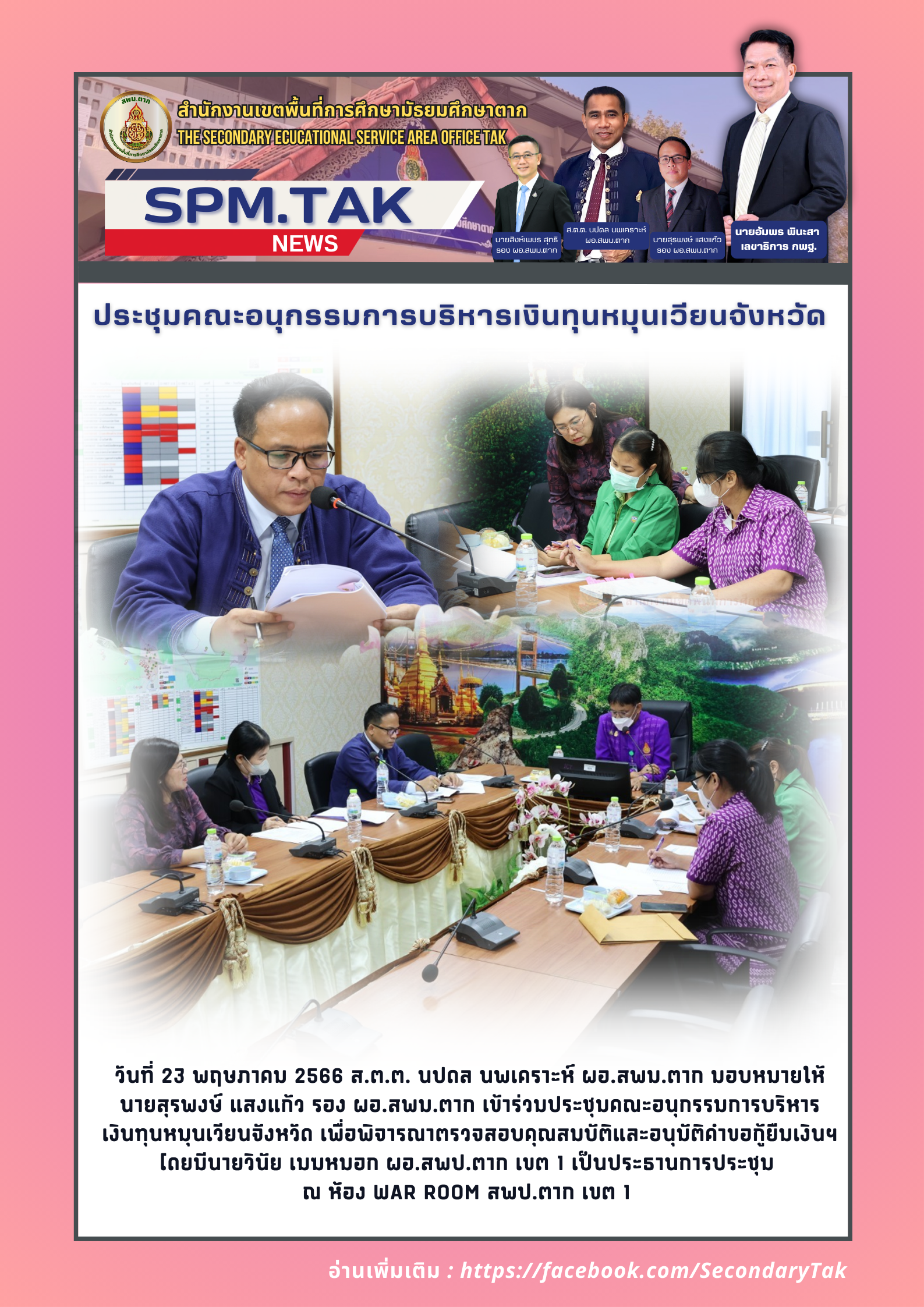 วันที่ 23 พฤษภาคม 2566 ส.ต.ต. นปดล นพเคราะห์ ผอ.สพม.ตาก มอบหมายให้ นายสุรพงษ์ แสงแก้ว รอง ผอ.สพม.ตาก เข้าร่วมประชุมคณะอนุกรรมการบริหาร เงินทุนหมุนเวียนจังหวัด เพื่อพิจารณาตรวจสอบคุณสมบัติและอนุมัติคำขอกู้ยืมเงินฯ โดยมีนายวินัย เมฆหมอก ผอ.สพป.ตาก เขต 1 เป็นประธานการประชุม ณ ห้อง War Room สพป.ตาก เขต 1 ขอบคุณภาพจาก สพป.ตาก เขต 1