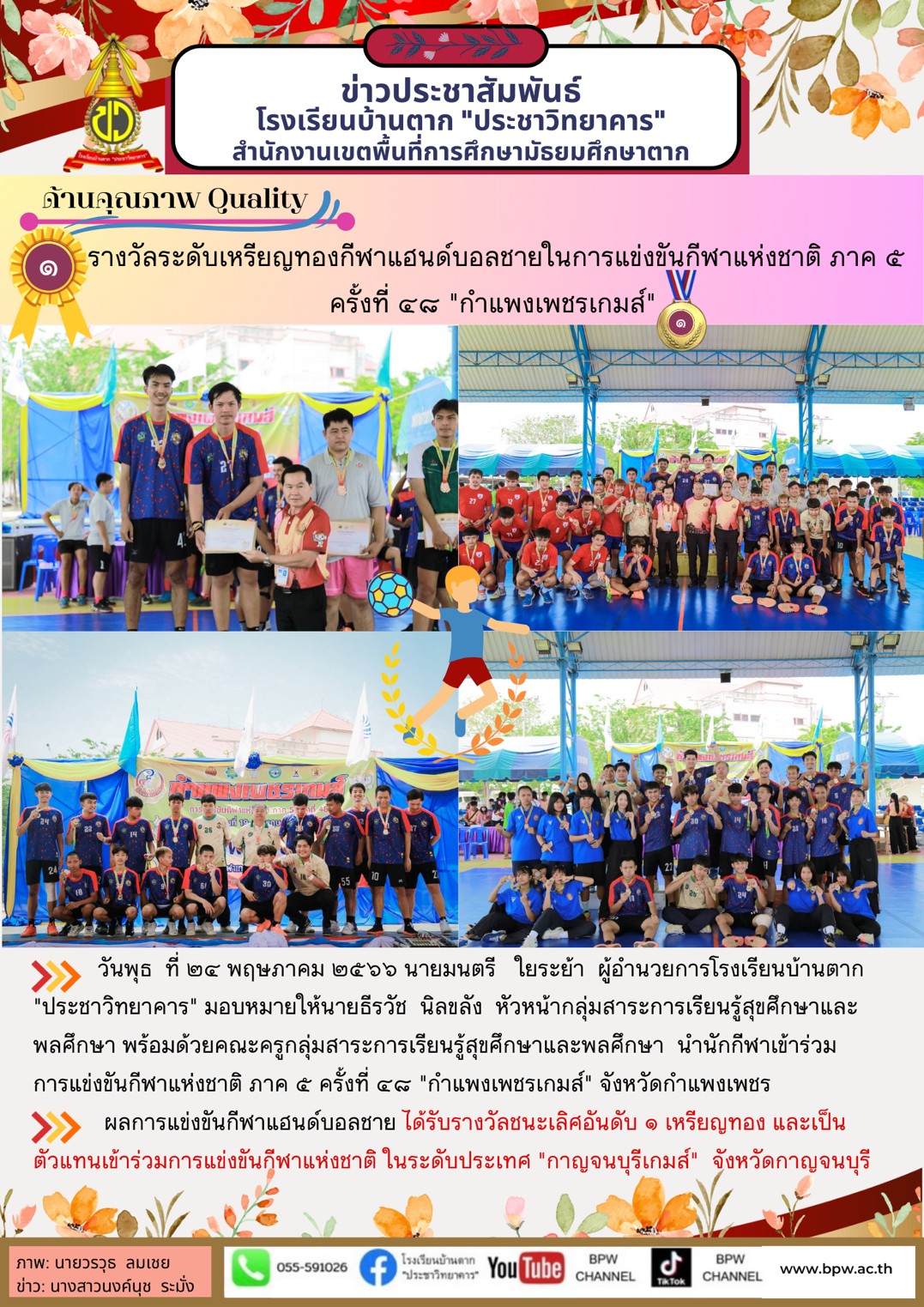 วันพุธ ที่ ๒๔ พฤษภาคม ๒๕๖๖ นายมนตรี ใยระย้า ผู้อำนวยการโรงเรียนบ้านตาก “ประชาวิทยาคาร” มอบหมายให้ นายธีรวัช นิลขลัง หัวหน้ากลุ่มสาระการเรียนรู้สุขศึกษาและพลศึกษา พร้อมด้วยคณะครูกลุ่มสาระการเรียนรู้สุศึกษาและพลศึกษา นำนักกีฬาเข้าร่วมการแข่งขันกีฬาแห่งชาติ ภาค ๕ ครั้งที่ ๔๘ “กำแพงเพชรเกมส์” จังหวัดกำแพงเพชร ผลการแข่งขันกีฬาแฮนด์บอลชาย ได้รับรางวัลชนะเลิศอันดับ ๑ เหรียญทอง และเป็นตัวแทนเข้าร่วมการแข่งขันกีฬาแห่งชาติ ในระดับประเทศ “กาญจนบุรีเกมส์” จังหวัดกาญจนบุรี